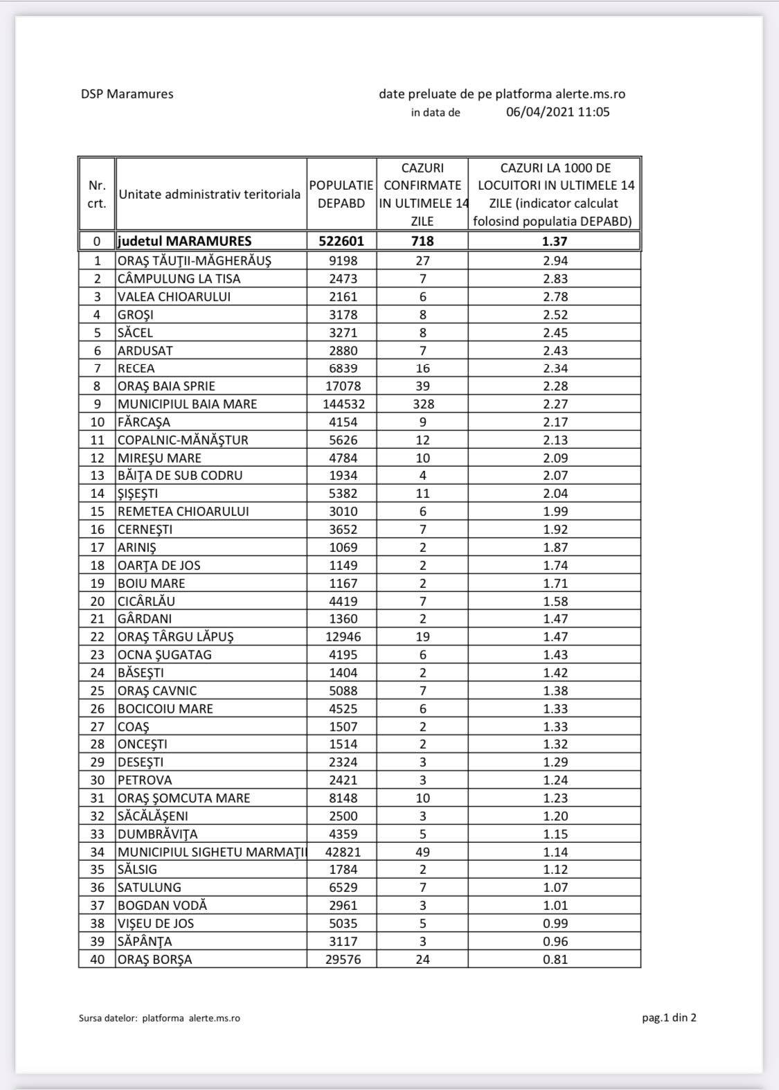 Astăzi, 6 aprilie, nu avem localități în carantină zonală în Maramureș. În ceea ce privește numărul de cazuri, municipiul Baia Mare se menține, logic, pe primul loc, întrucât are și cea mai mare populație.