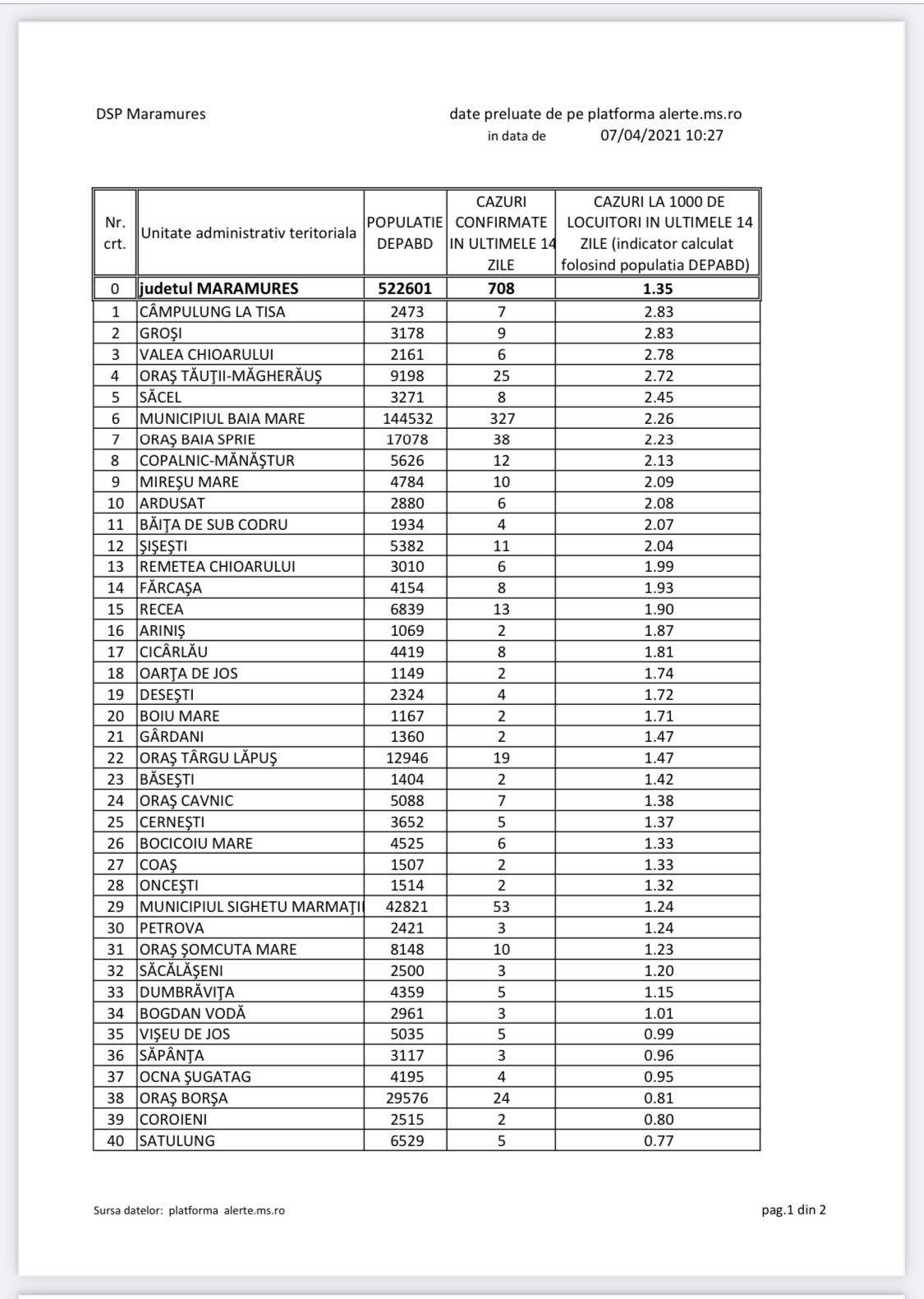 Așadar, avem zero unități administrativ-teritoriale (UAT) cu o incidență mai mare de 3. Acest lucru înseamnă zero UAT-uri în scenariul roșu. În prezent, avem 20 UAT-uri cu incidența de la 1,5 la 3 cazuri la mia de locuitori, considerate praguri de scenariu. Avem 21 UAT-uri în care nu s-a înregistrat niciun caz (sau nu a fost raportat) în ultimele două săptămâni. În prezent, nu avem localități carantinate zonal în Maramureș.