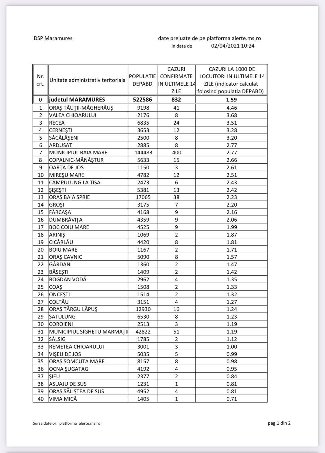 Astăzi, 2 aprilie, avem mai multe localități în carantină zonală, respectiv comuna Recea și orașul Tăuții Măgherăuș. Însă, orașul Tăuții Măgherăuș iese vineri, la ora 18.00. În ceea ce privește numărul de cazuri, municipiul Baia Mare se menține, logic, pe primul loc, întrucât are și cea mai mare populație.