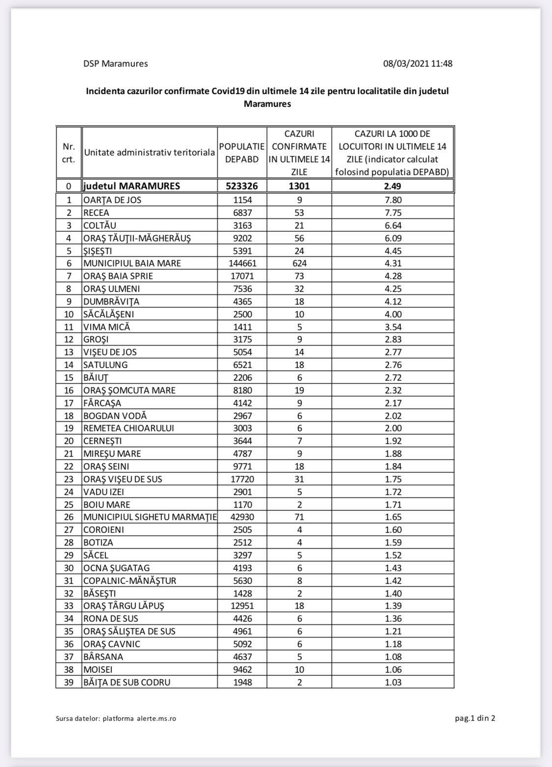 Astăzi, 8 martie, avem mai multe localități în carantină zonală, respectiv comunele Recea, Rona de Jos, Șișești, orașul Tăuții Măgherăuș și localitatea Arduzel, sat aparținător orașului Ulmeni. În ceea ce privește numărul de cazuri, municipiul Baia Mare se menține, logic, pe primul loc, întrucât are și cea mai mare populație.