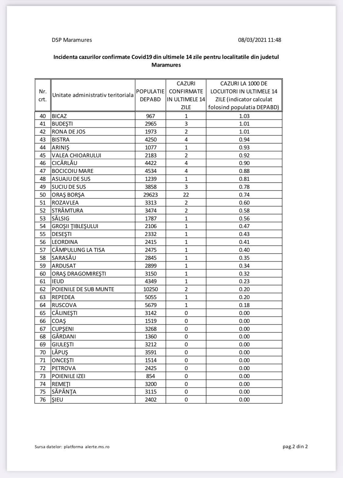 Așadar, avem două unități administrativ-teritoriale (UAT) cu incidența de peste 7, două UAT-uri cu o incidență mai mare de 6, dar sub 7, zero UAT-uri cu o incidență mai mare de 5, dar sub 6, șase UAT-uri cu o incidență mai mare sau egală cu 4, dar sub 5 și încă o UAT-uri cu o incidență mai mare de 3, dar sub 4. Acest lucru înseamnă un total de 11 UAT-uri în care incidența este mai mare de pragul de 3 cazuri la mia de locuitori. Totodată, mai avem și 18 UAT-uri cu incidența de la 1,5 la 3 cazuri la mia de locuitori, considerate praguri de scenariu. Avem 12 UAT-uri în care nu s-a înregistrat niciun caz (sau nu a fost raportat) în ultimele două săptămâni, respectiv Călinești, Coaș, Cupșeni, Gârdani, Giulești, Lăpuș, Oncești, Petrova, Poienile Izei, Remeți, Săpânța și Șieu. Ca atare, a crescut numărul cazurilor la nivel județean, în unele UAT-uri crescând incidența destul de mult. În prezent, avem mai multe localități carantinate zonal, respectiv UAT-urile Recea, Rona de Jos, Șișești și Tăuții Măgherăuș, respectiv localitățile menționate și cele aparținătoare aferente, și localitatea Arduzel, sat aparținător orașului Ulmeni.