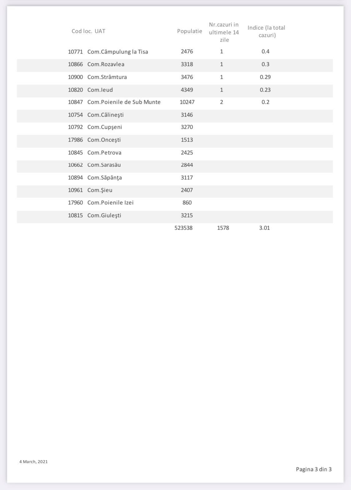 Așadar, avem o unitate administrativ-teritorială (UAT) cu incidența de peste 9, o UAT cu o incidență mai mare de 7, dar sub 8, o UAT cu o incidență mai mare de 6, dar sub 7, trei UAT-uri cu o incidență mai mare de 5, dar sub 6, trei UAT-uri cu o incidență mai mare de 4, dar sub 5 și încă trei UAT-uri cu o incidență mai mare de 3, dar sub 4. Acest lucru înseamnă un total de 12 UAT-uri în care incidența este mai mare de pragul de 3 cazuri la mia de locuitori. Totodată, mai avem și 29 UAT-uri cu incidența de la 1,5 la 3 cazuri la mia de locuitori, considerate praguri de scenariu. Avem numai nouă UAT-uri în care nu s-a înregistrat niciun caz (sau nu a fost raportat) în ultimele două săptămâni, respectiv Călinești, Cupșeni, Oncești, Petrova, Sarasău, Săpânța, Șieu, Poienile Izei și Giulești. Ca atare, a crescut numărul cazurilor la nivel județean, în unele UAT-uri crescând incidența destul de mult. În prezent, avem mai multe localități carantinate zonal, respectiv UAT-urile Recea, Rona de Jos, Șișești și Tăuții Măgherăuș, respectiv localitățile menționate și cele aparținătoare aferente.