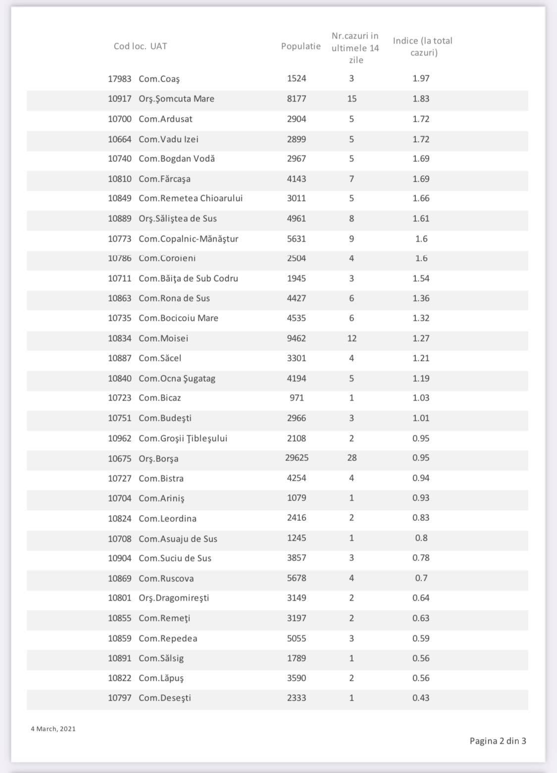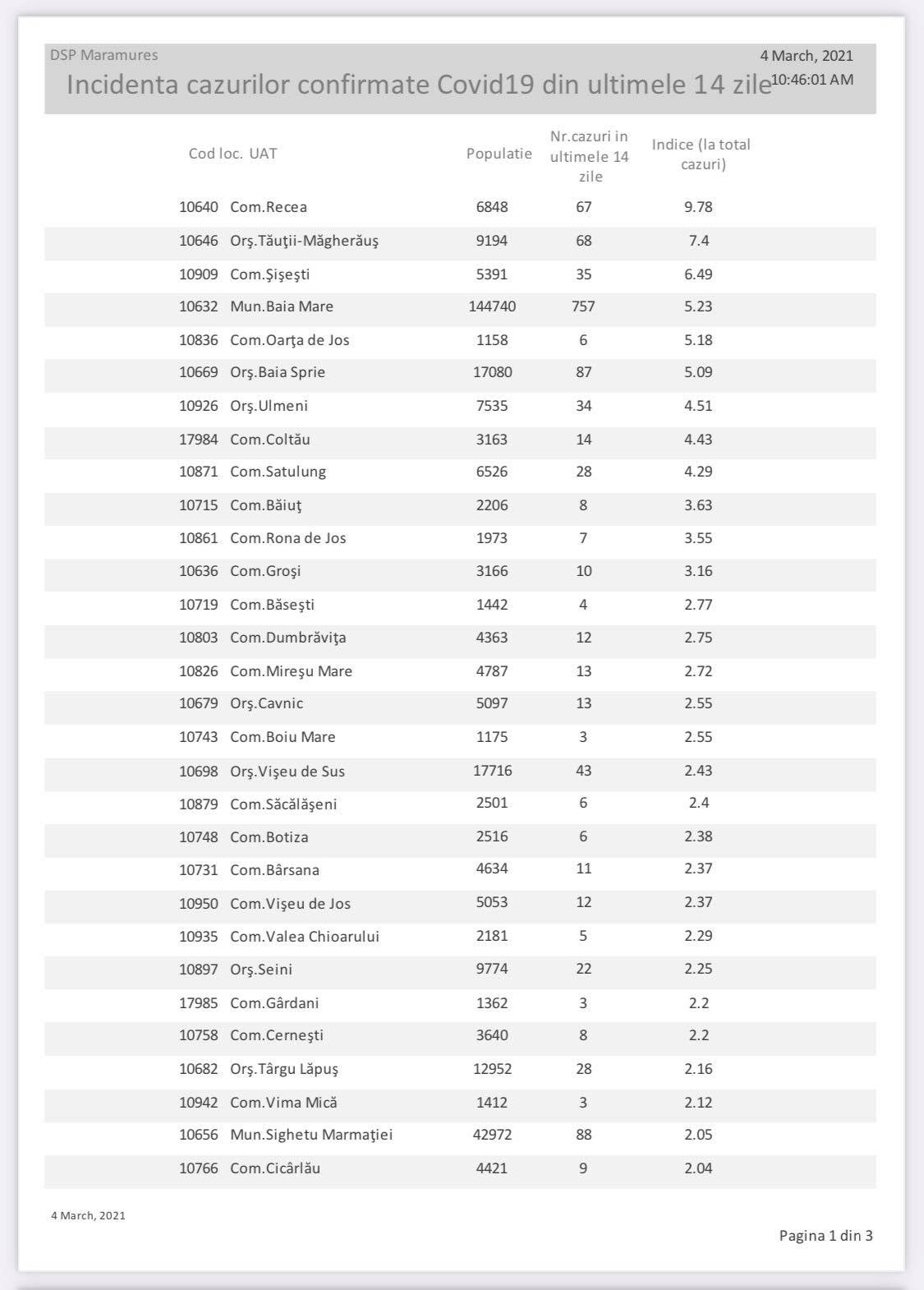 Așadar, avem o unitate administrativ-teritorială (UAT) cu incidența de peste 9, o UAT cu o incidență mai mare de 7, dar sub 8, o UAT cu o incidență mai mare de 6, dar sub 7, trei UAT-uri cu o incidență mai mare de 5, dar sub 6, trei UAT-uri cu o incidență mai mare de 4, dar sub 5 și încă trei UAT-uri cu o incidență mai mare de 3, dar sub 4. Acest lucru înseamnă un total de 12 UAT-uri în care incidența este mai mare de pragul de 3 cazuri la mia de locuitori. Totodată, mai avem și 29 UAT-uri cu incidența de la 1,5 la 3 cazuri la mia de locuitori, considerate praguri de scenariu. Avem numai nouă UAT-uri în care nu s-a înregistrat niciun caz (sau nu a fost raportat) în ultimele două săptămâni, respectiv Călinești, Cupșeni, Oncești, Petrova, Sarasău, Săpânța, Șieu, Poienile Izei și Giulești. Ca atare, a crescut numărul cazurilor la nivel județean, în unele UAT-uri crescând incidența destul de mult. În prezent, avem mai multe localități carantinate zonal, respectiv UAT-urile Recea, Rona de Jos, Șișești și Tăuții Măgherăuș, respectiv localitățile menționate și cele aparținătoare aferente.