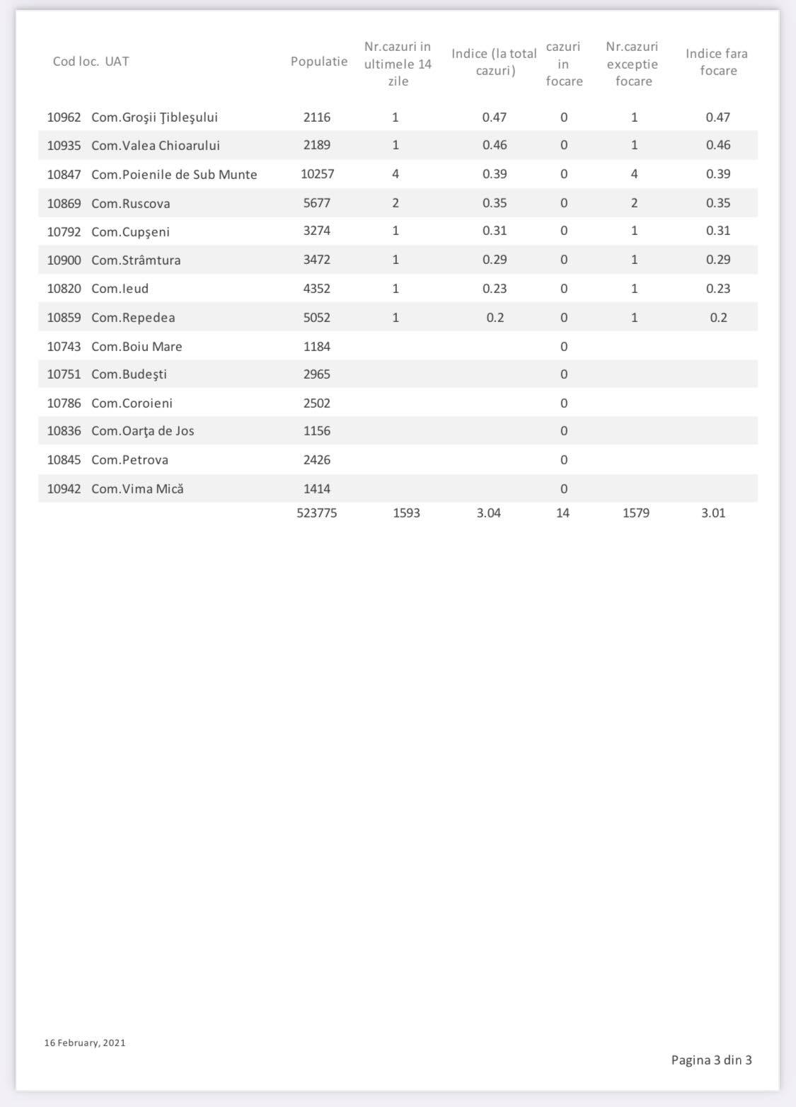 Așadar, avem o unitate administrativ-teritorială (UAT) cu incidența de peste 8, o UAT-uri cu o incidență mai mare de 6, dar sub 7, patru UAT-uri cu o incidență mai mare de 5, dar sub 6, șase UAT-uri cu o incidență mai mare de 4, dar sub 5 și încă trei UAT-uri cu o incidență mai mare de 3, dar sub 4. Acest lucru înseamnă un total de 15 UAT-uri în care incidența este mai mare de pragul de 3 cazuri la mia de locuitori. Totodată, mai avem și 26 UAT-uri cu incidența de la 1,5 la 3 cazuri la mia de locuitori, considerate praguri de scenariu. Avem numai șase UAT-uri în care nu s-a înregistrat niciun caz (sau nu a fost raportat) în ultimele două săptămâni, respectiv Boiu Mare, Budești, Coroieni, Oarța de Jos, Petrova și Vima Mică. Ca atare, a crescut numărul cazurilor la nivel județean, în unele UAT-uri crescând incidența destul de mult. În prezent, avem mai multe localități carantinate zonal, respectiv comunele Poienile Izei și Gârdani, orașul Seini, întreaga comună Recea și localitatea Remetea Chioarului.