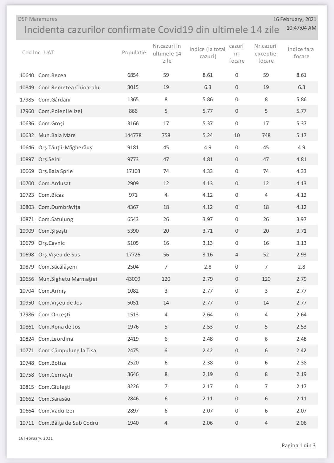 Numărul cazurilor de COVID-19 în Maramureș a înregistrat o mică creștere față de raportarea de ieri. Iată cifrele aferente zilei de 16 februarie, cele mai recente publicate de DSP Maramureș! În total, în ultimele două săptămâni, s-au înregistrat 1.593 cazuri de COVID-19 în județ, din care 14 în focare, în Baia Mare și Vișeu de Sus și 1.579 în afara focarelor. Asta înseamnă o incidență de 3,01 fără focare și 3,04 cu focare, însă cea cu focare este cea luată momentan în considerare. Astăzi, 16 februarie, avem mai multe localități în carantină zonală, respectiv comunele Poienile Izei și Gârdani, orașul Seini, întreaga comună Recea și localitatea Remetea Chioarului.