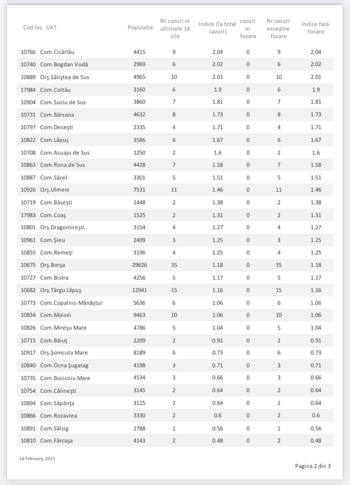 Așadar, avem o unitate administrativ-teritorială (UAT) cu incidența de peste 8, o UAT-uri cu o incidență mai mare de 6, dar sub 7, patru UAT-uri cu o incidență mai mare de 5, dar sub 6, șase UAT-uri cu o incidență mai mare de 4, dar sub 5 și încă trei UAT-uri cu o incidență mai mare de 3, dar sub 4. Acest lucru înseamnă un total de 15 UAT-uri în care incidența este mai mare de pragul de 3 cazuri la mia de locuitori. Totodată, mai avem și 26 UAT-uri cu incidența de la 1,5 la 3 cazuri la mia de locuitori, considerate praguri de scenariu. Avem numai șase UAT-uri în care nu s-a înregistrat niciun caz (sau nu a fost raportat) în ultimele două săptămâni, respectiv Boiu Mare, Budești, Coroieni, Oarța de Jos, Petrova și Vima Mică. Ca atare, a crescut numărul cazurilor la nivel județean, în unele UAT-uri crescând incidența destul de mult. În prezent, avem mai multe localități carantinate zonal, respectiv comunele Poienile Izei și Gârdani, orașul Seini, întreaga comună Recea și localitatea Remetea Chioarului.