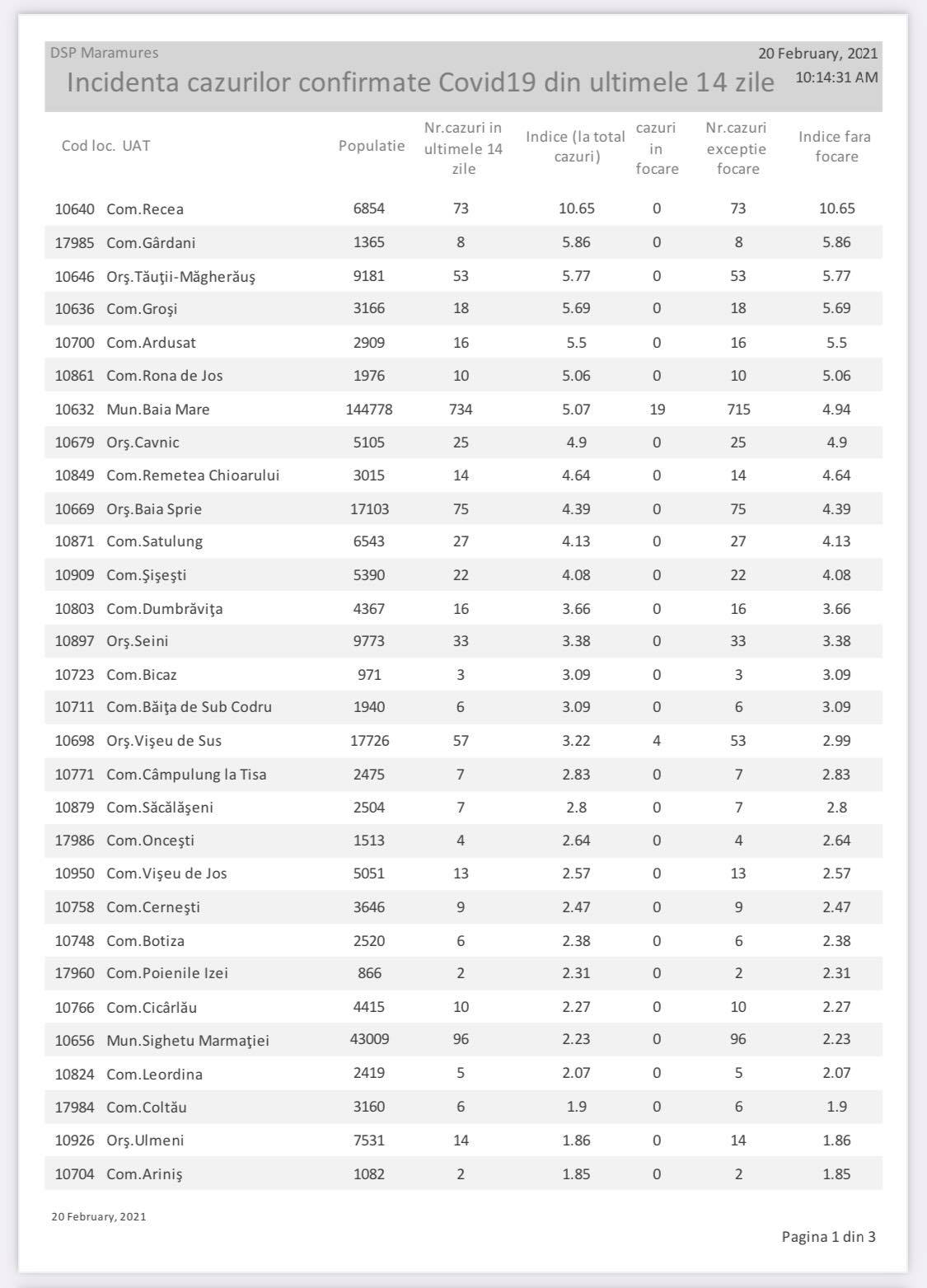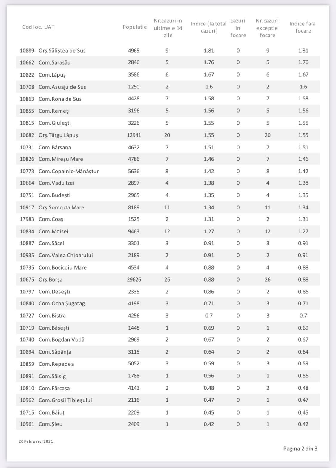 Așadar, avem o unitate administrativ-teritorială (UAT) cu incidența de peste 10, cinci UAT-uri cu o incidență mai mare de 5, dar sub 6, șase UAT-uri cu o incidență mai mare de 4, dar sub 5 și încă patru UAT-uri cu o incidență mai mare de 3, dar sub 4. Calculul nu ia în calcul focarele. Acest lucru înseamnă un total de 16 UAT-uri în care incidența este mai mare de pragul de 3 cazuri la mia de locuitori. Totodată, mai avem și 23 UAT-uri cu incidența de la 1,5 la 3 cazuri la mia de locuitori, considerate praguri de scenariu. În cazul incidenței cu focare, avem o UAT cu incidența de peste 10, șase UAT-uri cu o incidență mai mare de 5, dar sub 6, cinci UAT-uri cu o incidență mai mare de 4, dar sub 5 și încă cinci UAT-uri cu o incidență mai mare de 3, dar sub 4. Acest lucru înseamnă un total de 17 UAT-uri în care incidența este mai mare de pragul de 3 cazuri la mia de locuitori. Totodată, mai avem și 22 UAT-uri cu incidența de la 1,5 la 3 cazuri la mia de locuitori, considerate praguri de scenariu. Avem numai șapte UAT-uri în care nu s-a înregistrat niciun caz (sau nu a fost raportat) în ultimele două săptămâni, respectiv Vima Mică, Petrova, Boiu Mare, Oarța de Jos, Dragomirești, Coroieni și Rozavlea. Ca atare, a crescut numărul cazurilor la nivel județean, în unele UAT-uri crescând incidența destul de mult. În prezent, avem mai multe localități carantinate zonal, respectiv comunele Poienile Izei și Gârdani, orașul Seini, comunele Recea, Remetea Chioarului și Groși.