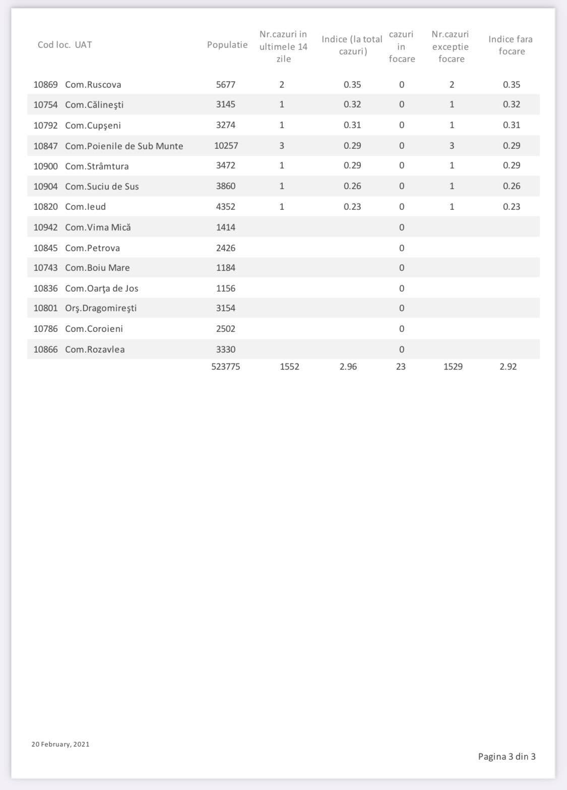 Numărul cazurilor de COVID-19 în Maramureș a înregistrat o mică scădere față de raportarea de ieri. Iată cifrele aferente zilei de 20 februarie, cele mai recente publicate de DSP Maramureș! În total, în ultimele două săptămâni, s-au înregistrat 1.552 cazuri de COVID-19 în județ, din care 23 în focare, în Baia Mare și Vișeu de Sus și 1.529 în afara focarelor. Asta înseamnă o incidență de 2,92 fără focare și 2,96 cu focare, însă cea fără focare este cea luată momentan în considerare. Astăzi, 20 februarie, avem mai multe localități în carantină zonală, respectiv comunele Poienile Izei și Gârdani, orașul Seini, comunele Recea și Remetea Chioarului și Groși.