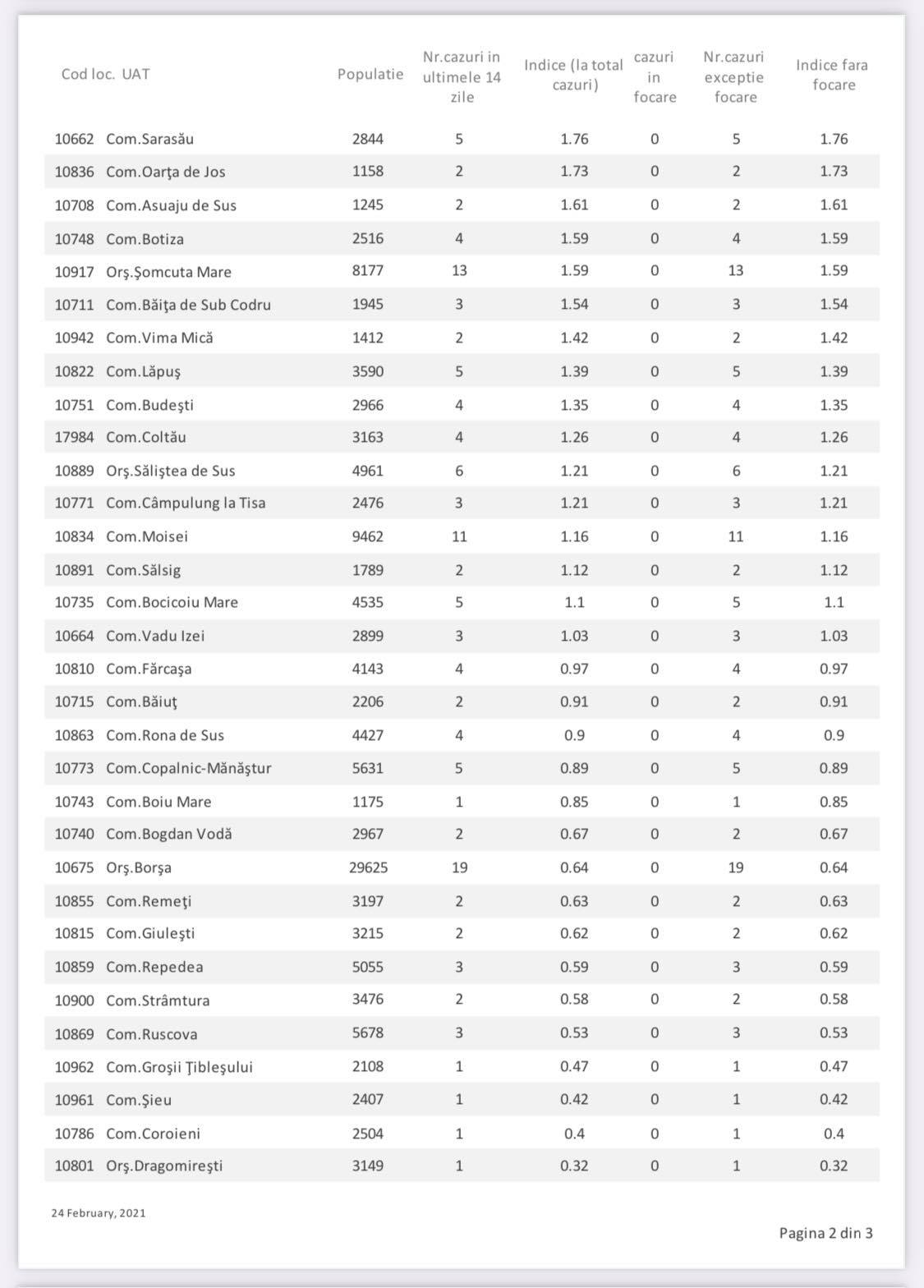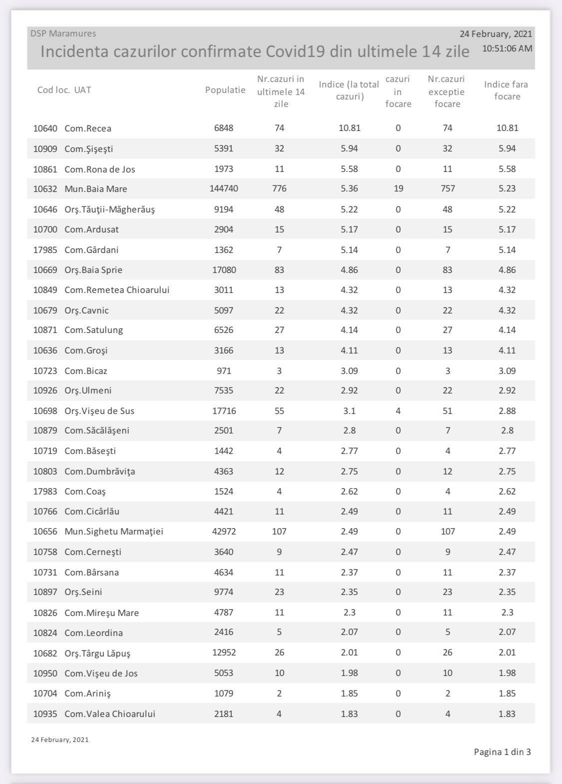 Referitor la incidența cazurilor la mia de locuitori, vorbim despre două orașe și trei comune pe primele cinci locuri ale clasamentului. Acestea sunt, în ordine, comuna Recea, cu o incidență de peste 10 cazuri la mia de locuitori, comunele Șișești, care urcă pe locul doi și Rona de Jos, municipiul Baia Mare, orașul Tăuții Măgherăuș și comunele Ardusat și Gârdani, cu o incidență mai mare de 5, dar sub 6, orașul Baia-Sprie, comuna Remetea Chioarului, orașul Cavnic și comunele Satulung și Groși, cu o incidență mai mare de 4, dar sub 5, respectiv comuna Bicaz, cu o incidență mai mare de 3, dar sub 4. Facem precizarea că orașul Vișeu de Sus are o incidență de sub 3 fără cazurile din focare și peste pragul de 3 cu cazurile din focare.
