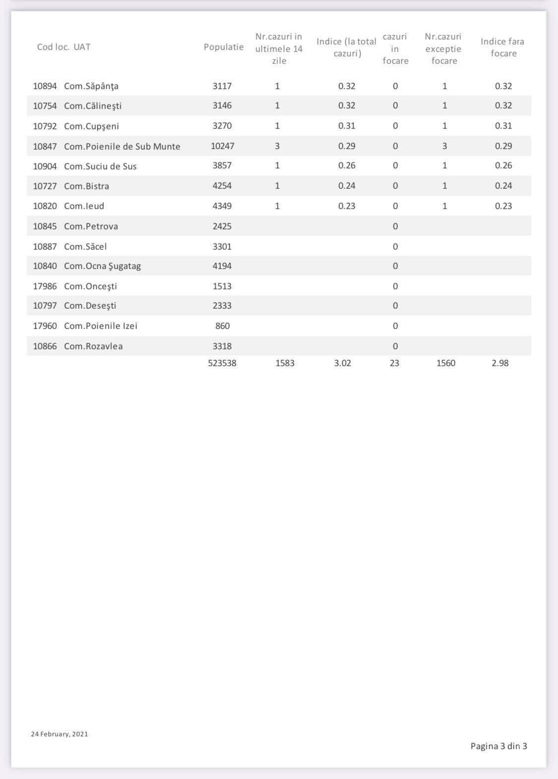 Numărul cazurilor de COVID-19 în Maramureș a înregistrat o mică creștere față de raportarea de la începutul săptămânii. Iată cifrele aferente zilei de 24 februarie, cele mai recente publicate de DSP Maramureș! În total, în ultimele două săptămâni, s-au înregistrat 1.583 cazuri de COVID-19 în județ, din care 23 în focare, în Baia Mare și Vișeu de Sus și 1.560 în afara focarelor. Asta înseamnă o incidență de 2,98 fără focare și 3,02 cu focare. Astăzi, 24 februarie, avem mai multe localități în carantină zonală, respectiv comunele Gârdani, Recea, Remetea Chioarului, Groși și Rona de Jos.