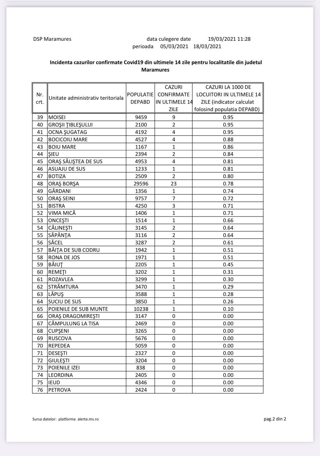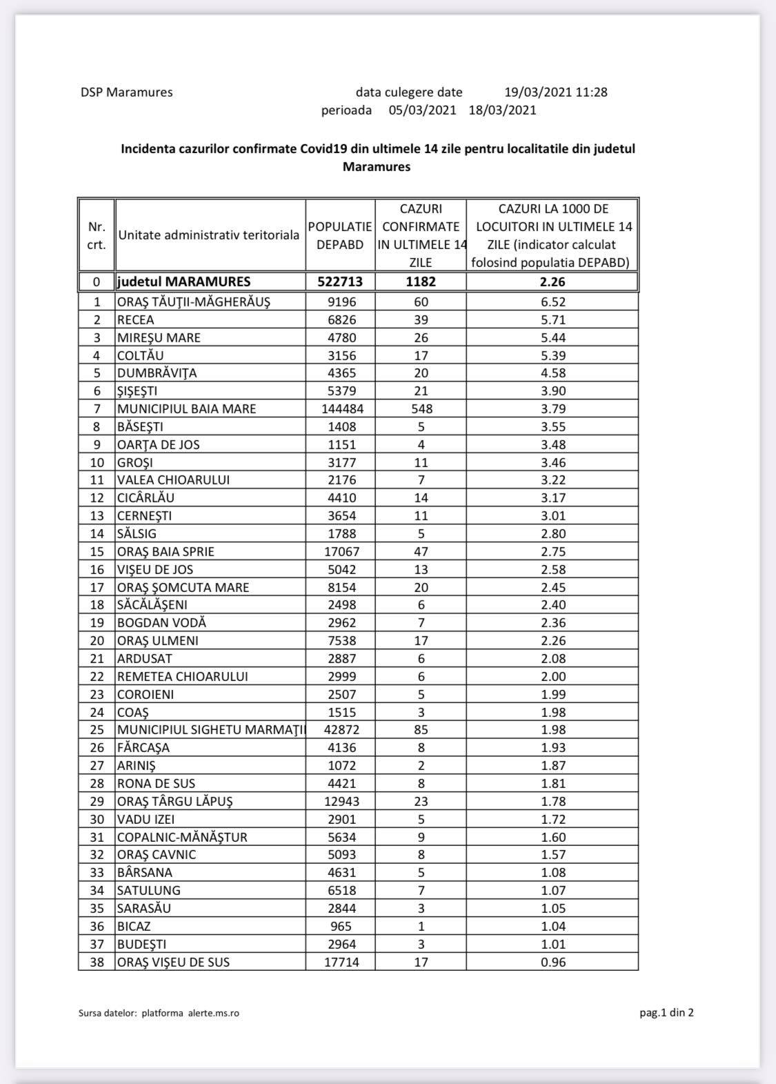 Așadar, avem o unitate administrativ-teritoriale (UAT) cu incidența de peste 6, trei UAT-uri cu o incidență mai mare de 5, dar sub 6, o UAT cu o incidență mai mare de 4, dar sub 5 și încă opt UAT-uri cu o incidență mai mare de 3, dar sub 4. Acest lucru înseamnă un total de 13 UAT-uri în care incidența este mai mare de pragul de 3 cazuri la mia de locuitori. Totodată, mai avem și 19 UAT-uri cu incidența de la 1,5 la 3 cazuri la mia de locuitori, considerate praguri de scenariu. Avem 11 UAT-uri în care nu s-a înregistrat niciun caz (sau nu a fost raportat) în ultimele două săptămâni. Ca atare, a crescut numărul cazurilor la nivel județean, în unele UAT-uri crescând incidența destul de mult. În prezent, avem mai multe localități carantinate zonal, respectiv UAT-urile Recea, Tăuții Măgherăuș și Coltău, ceea ce înseamnă atât localitățile menționate, cât și cele aparținătoare aferente, și localitatea Arduzel, sat aparținător orașului Ulmeni. Șișești iese astăzi, vineri, 19 martie, din carantina zonală.