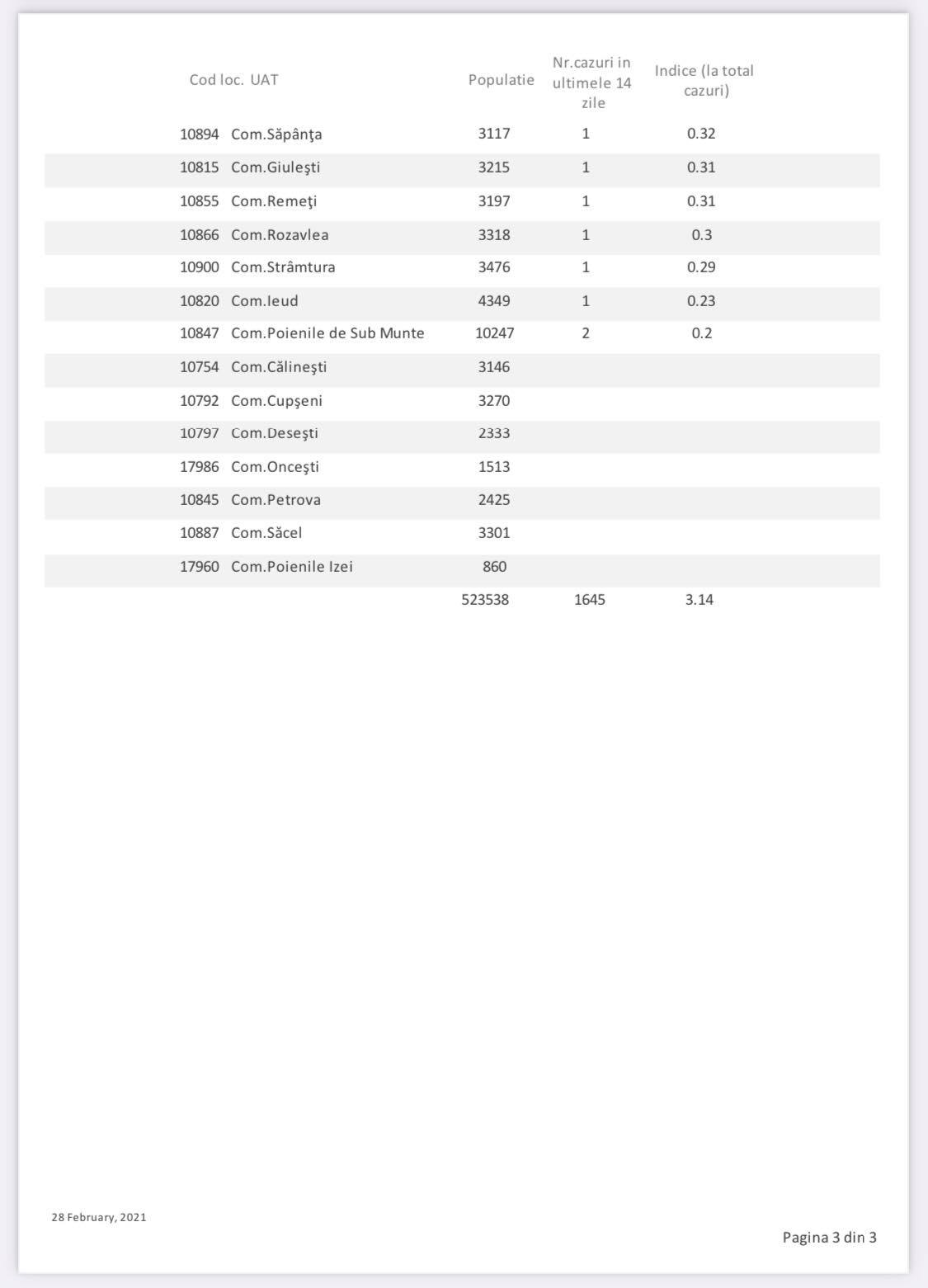 Așadar, avem o unitate administrativ-teritorială (UAT) cu incidența de peste 10, două UAT-uri cu o incidență mai mare de 6, dar sub 7, trei UAT-uri cu o incidență mai mare de 5, dar sub 6, două UAT-uri cu o incidență mai mare de 4, dar sub 5 și încă cinci UAT-uri cu o incidență mai mare de 3, dar sub 4. Acest lucru înseamnă un total de 13 UAT-uri în care incidența este mai mare de pragul de 3 cazuri la mia de locuitori. Totodată, mai avem și 22 UAT-uri cu incidența de la 1,5 la 3 cazuri la mia de locuitori, considerate praguri de scenariu. Avem numai șapte UAT-uri în care nu s-a înregistrat niciun caz (sau nu a fost raportat) în ultimele două săptămâni, respectiv Călinești, Cupșeni, Desești, Oncești, Petrova, Săcel și Poienile Izei. Ca atare, a crescut numărul cazurilor la nivel județean, în unele UAT-uri crescând incidența destul de mult. În prezent, avem mai multe localități carantinate zonal, respectiv comunele Gârdani, Recea, Remetea Chioarului, Groși, Rona de Jos, Șișești și orașul Tăuții Măgherăuș, cu localitățile aferente.