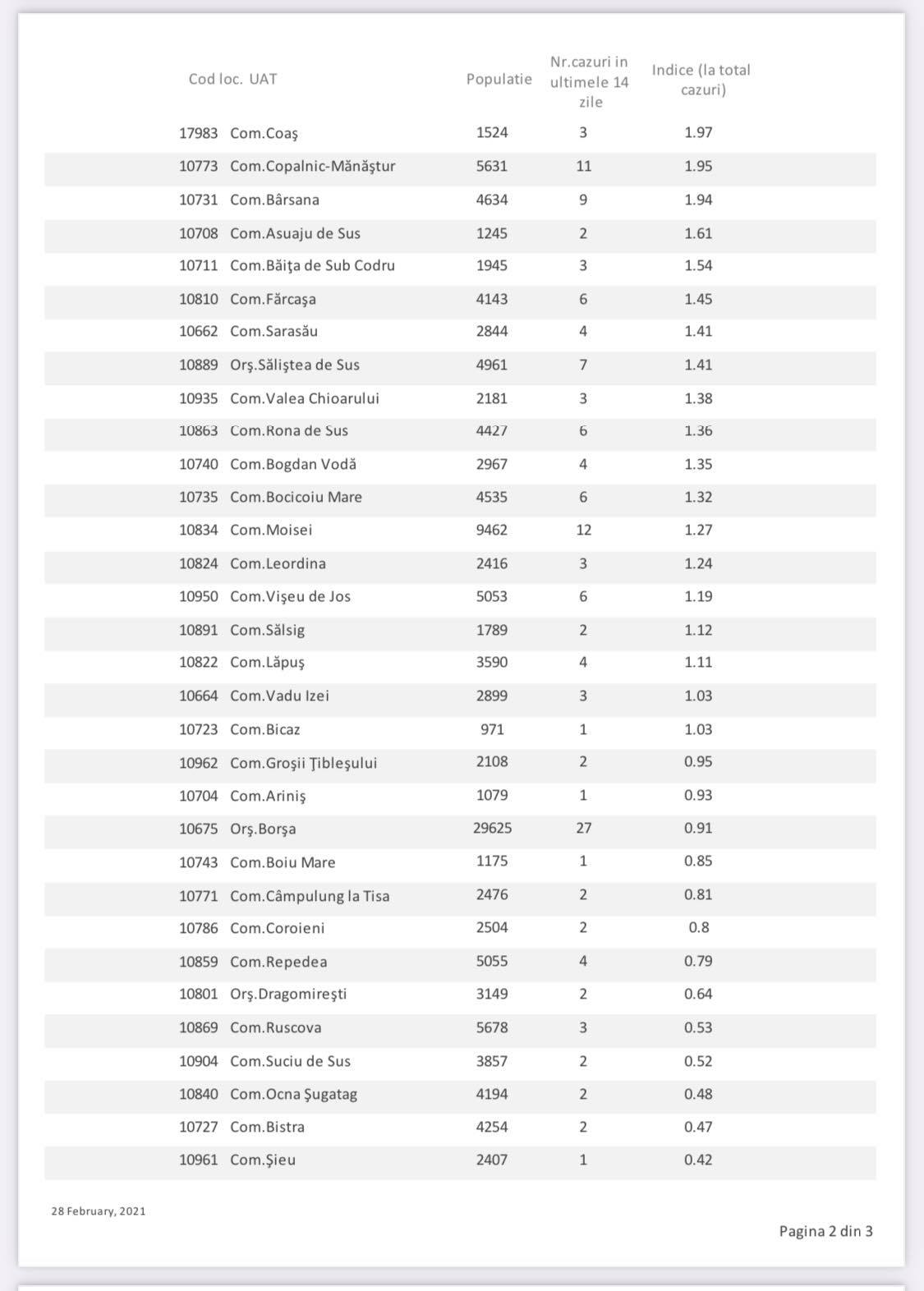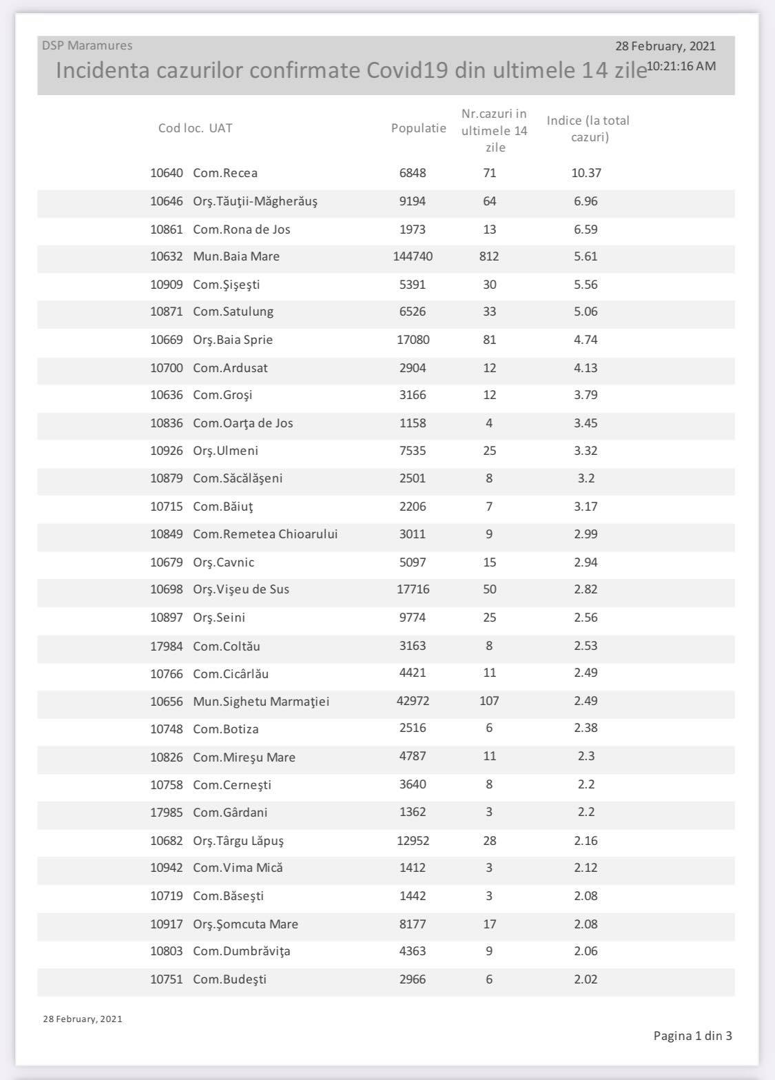 Așadar, avem o unitate administrativ-teritorială (UAT) cu incidența de peste 10, două UAT-uri cu o incidență mai mare de 6, dar sub 7, trei UAT-uri cu o incidență mai mare de 5, dar sub 6, două UAT-uri cu o incidență mai mare de 4, dar sub 5 și încă cinci UAT-uri cu o incidență mai mare de 3, dar sub 4. Acest lucru înseamnă un total de 13 UAT-uri în care incidența este mai mare de pragul de 3 cazuri la mia de locuitori. Totodată, mai avem și 22 UAT-uri cu incidența de la 1,5 la 3 cazuri la mia de locuitori, considerate praguri de scenariu. Avem numai șapte UAT-uri în care nu s-a înregistrat niciun caz (sau nu a fost raportat) în ultimele două săptămâni, respectiv Călinești, Cupșeni, Desești, Oncești, Petrova, Săcel și Poienile Izei. Ca atare, a crescut numărul cazurilor la nivel județean, în unele UAT-uri crescând incidența destul de mult. În prezent, avem mai multe localități carantinate zonal, respectiv comunele Gârdani, Recea, Remetea Chioarului, Groși, Rona de Jos, Șișești și orașul Tăuții Măgherăuș, cu localitățile aferente.