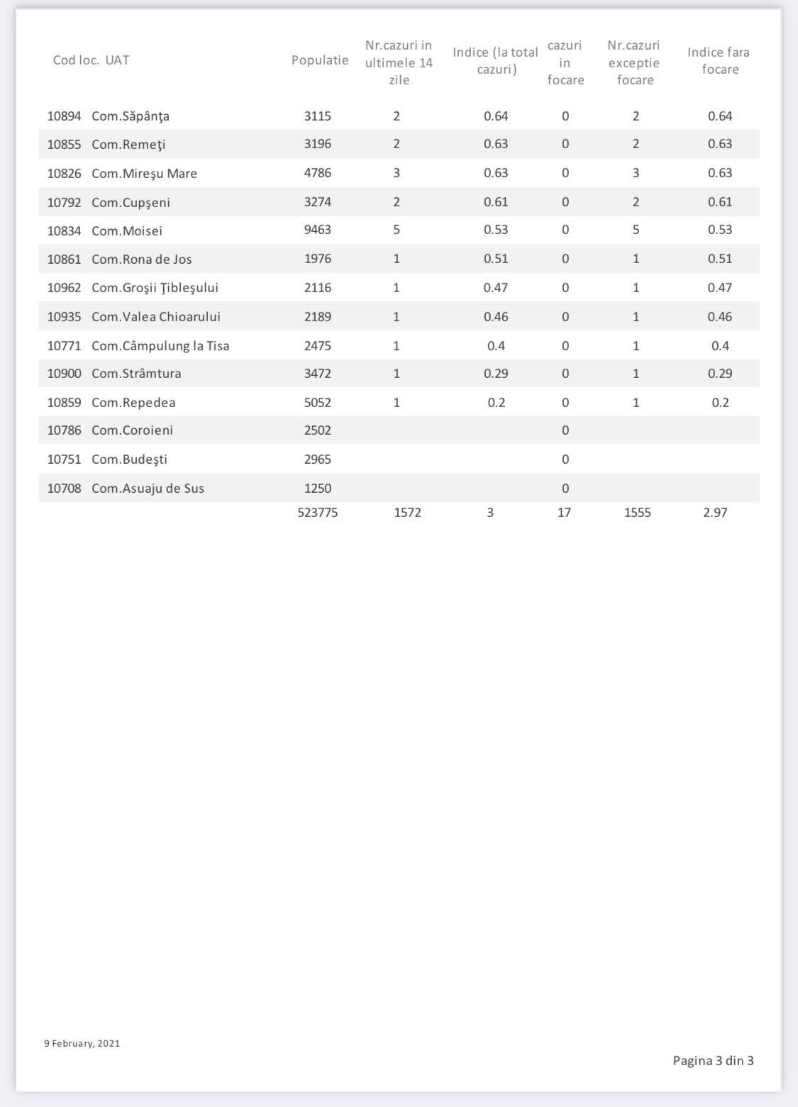 Așadar, avem o unitate administrativ-teritorială (UAT) cu incidența de peste 9, trei UAT-uri cu o incidență mai mare de 5, dar sub 6, opt UAT-uri cu o incidență mai mare de 4, dar sub 5 și încă șase UAT-uri cu o incidență mai mare de 3, dar sub 4. Acest lucru înseamnă un total de 18 UAT-uri în care incidența este mai mare de pragul de 3 cazuri la mia de locuitori. Totodată, mai avem și 22 UAT-uri cu incidența de la 1,5 la 3 cazuri la mia de locuitori, considerate praguri de scenariu. Avem numai trei UAT-uri în care nu s-a înregistrat niciun caz (sau nu a fost raportat) în ultimele două săptămâni, respectiv Coroieni, Budești și Asuaju de Sus. Ca atare, a crescut numărul cazurilor la nivel județean, în unele UAT-uri crescând incidența destul de mult. În prezent, avem două localități carantinate zonal, Poienile Izei și Gârdani.