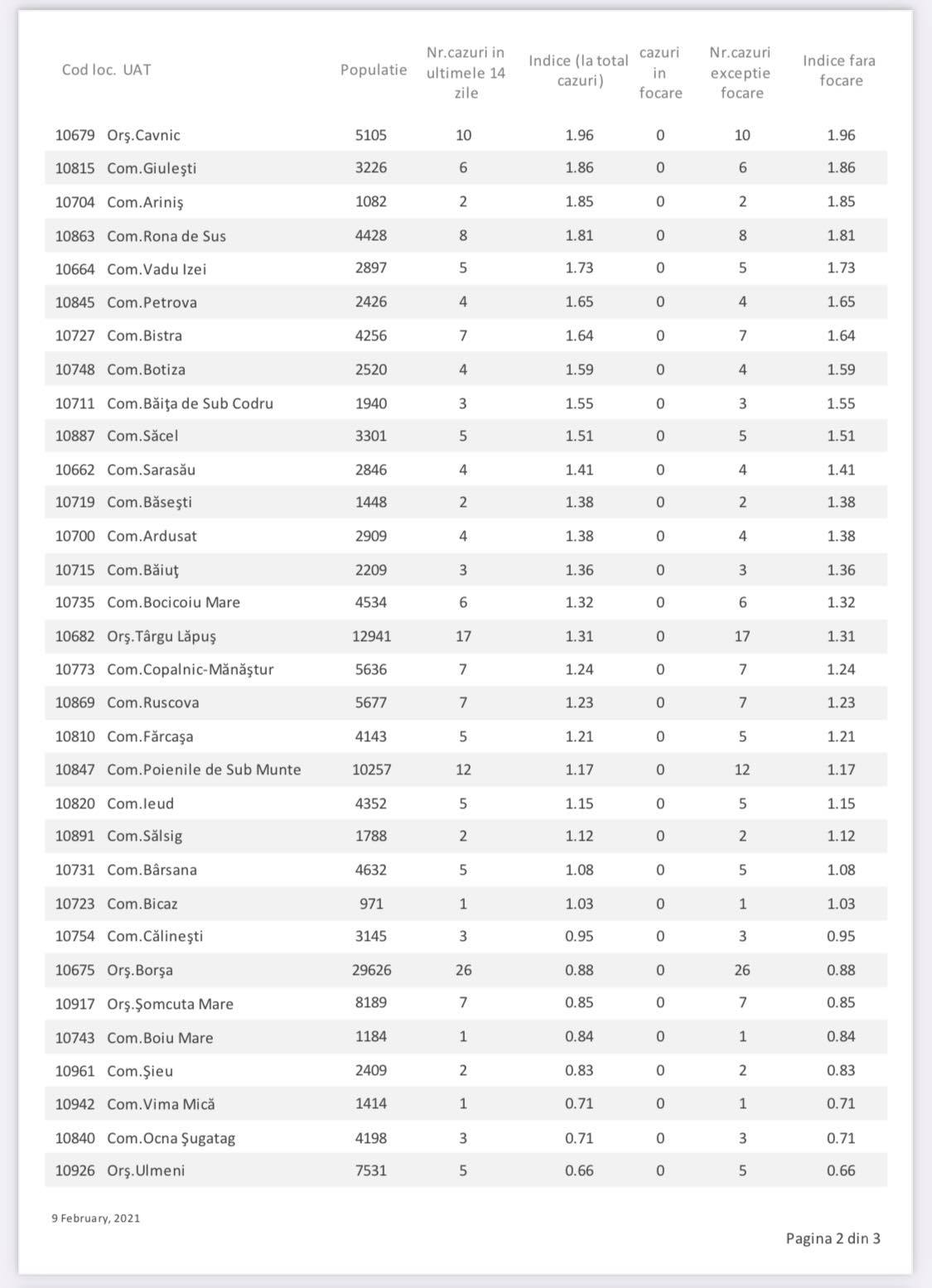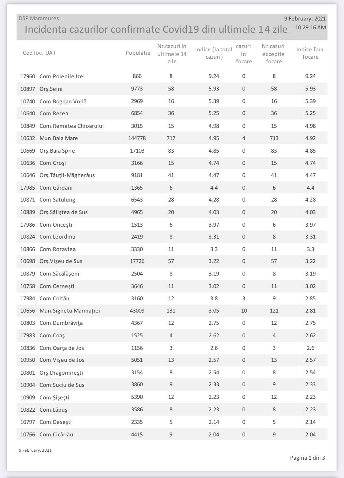 Așadar, avem o unitate administrativ-teritorială (UAT) cu incidența de peste 9, trei UAT-uri cu o incidență mai mare de 5, dar sub 6, opt UAT-uri cu o incidență mai mare de 4, dar sub 5 și încă șase UAT-uri cu o incidență mai mare de 3, dar sub 4. Acest lucru înseamnă un total de 18 UAT-uri în care incidența este mai mare de pragul de 3 cazuri la mia de locuitori. Totodată, mai avem și 22 UAT-uri cu incidența de la 1,5 la 3 cazuri la mia de locuitori, considerate praguri de scenariu. Avem numai trei UAT-uri în care nu s-a înregistrat niciun caz (sau nu a fost raportat) în ultimele două săptămâni, respectiv Coroieni, Budești și Asuaju de Sus. Ca atare, a crescut numărul cazurilor la nivel județean, în unele UAT-uri crescând incidența destul de mult. În prezent, avem două localități carantinate zonal, Poienile Izei și Gârdani.
