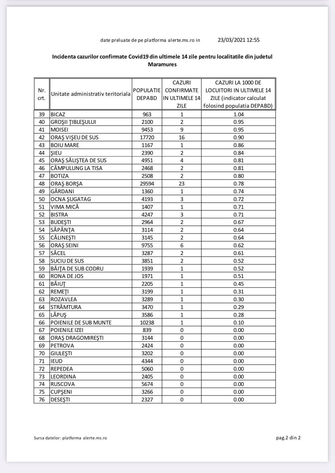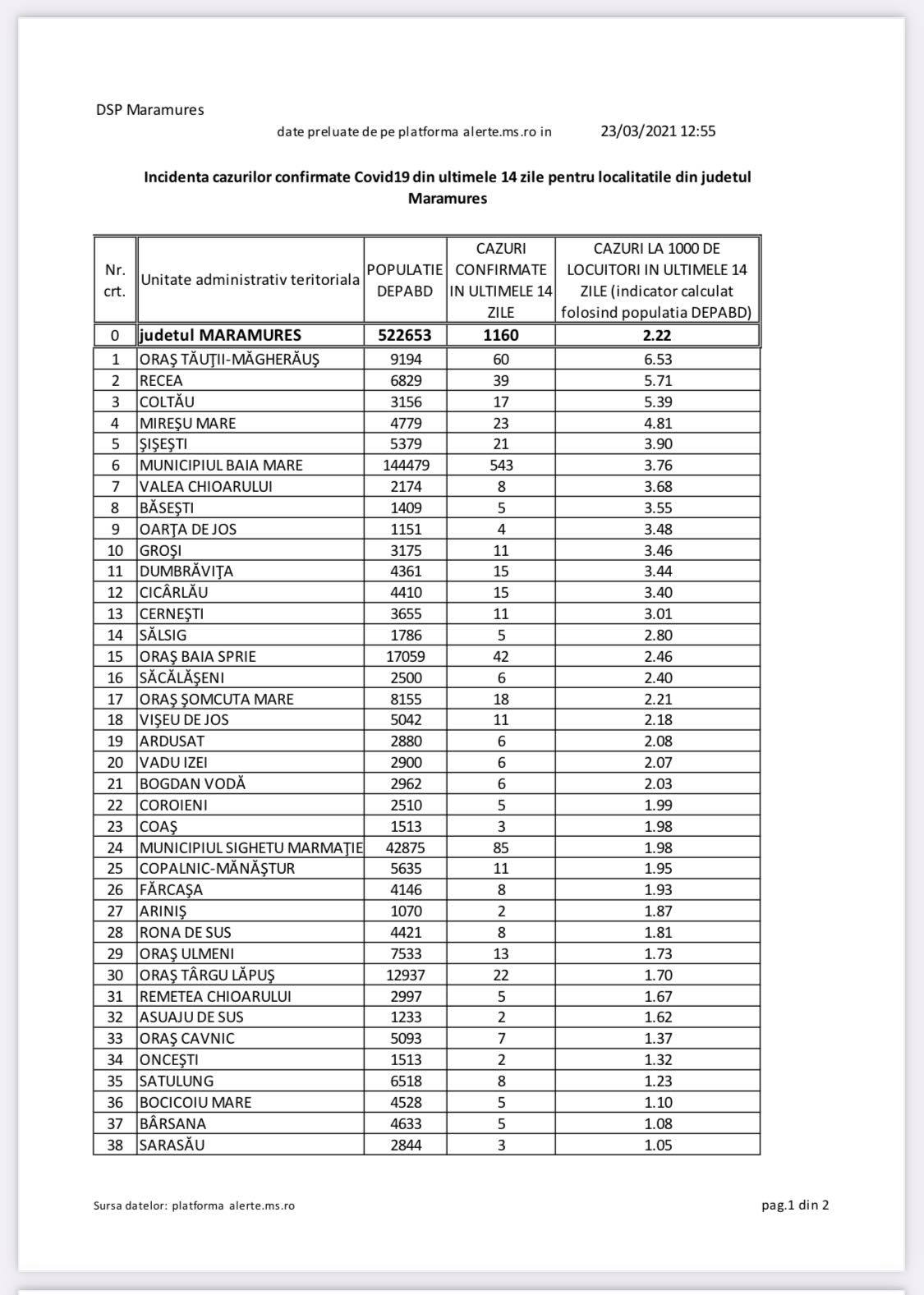 Astăzi, 23 martie, avem mai multe localități în carantină zonală, respectiv comuna Recea, orașul Tăuții Măgherăuș și comuna Coltău. În ceea ce privește numărul de cazuri, municipiul Baia Mare se menține, logic, pe primul loc, întrucât are și cea mai mare populație.