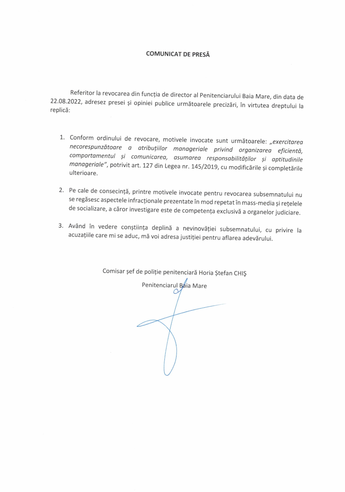 Cel care a ocupat preț de ani la rând funcția de director al Penitenciarului Baia Mare, Horia Chiș, a ținut să facă mai multe precizări legate de revocarea sa din funcție. Acesta arată că va apela la justiție. Iată comunicatul de presă emis!