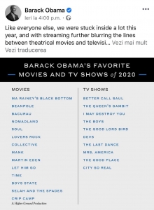 Barack Obama a postat pe pagina sa de Instagram o listă cu filme și seriale apărute în 2020 și despre care fostul președinte spune că sunt preferatele sale în acest an.