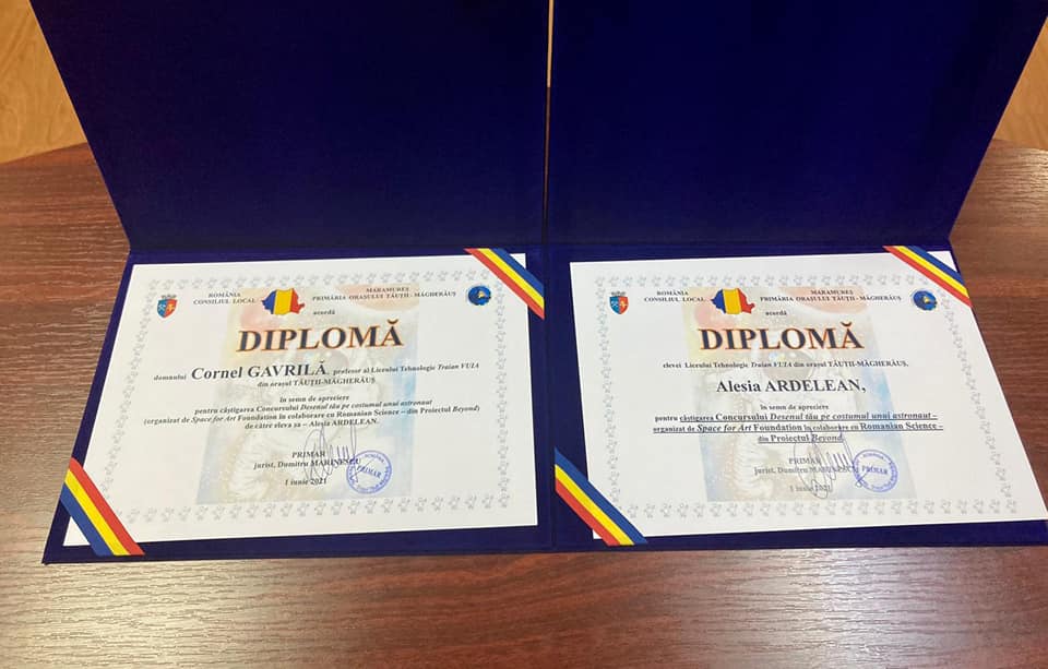 Recunoaștere: Eleva din Tăuții Măgherăuș a cărei pictură va fi imprimată pe un costum de cosmonaut și dirigintele ei, răsplătiți cu diplome de apreciere (FOTO)