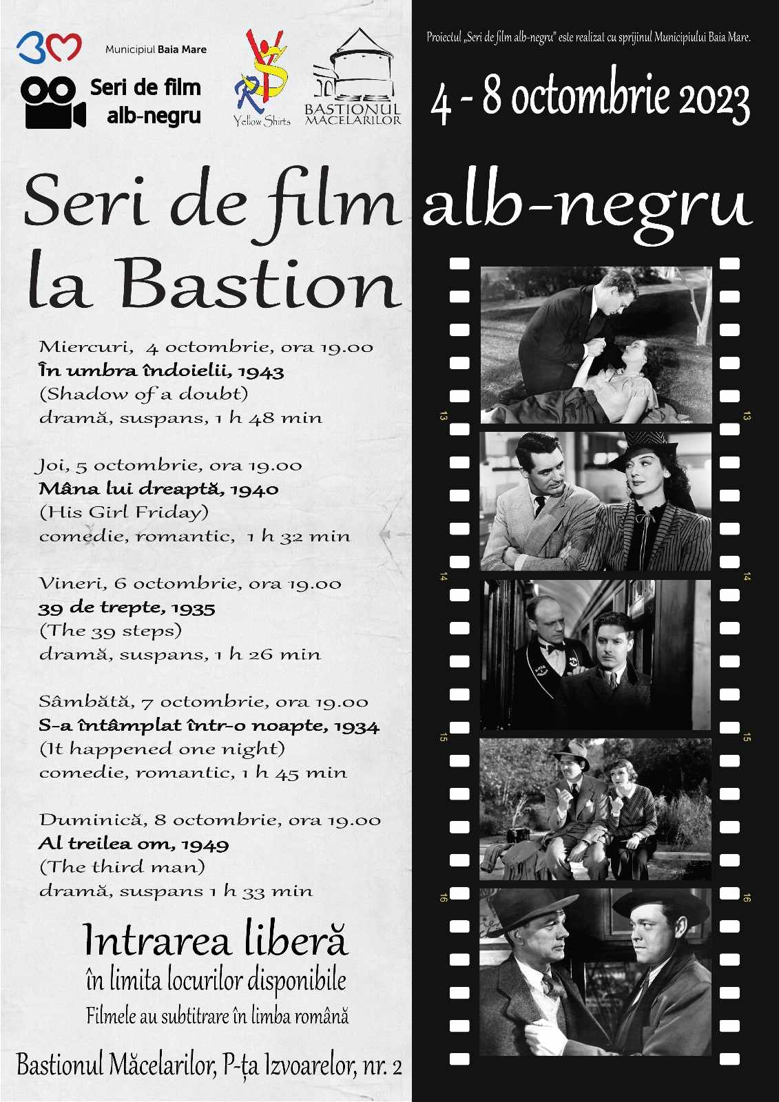 Iubitorii de film pot urmări în perioada 4-8 octombrie 2023 la Bastionul Măcelarilor, cinci proiecții clasice de film alb-negru, subtitrate în limba română. Programul începe de la ora 19:00 în fiecare seară, iar intrarea este liberă în limita locurilor disponibile. Pentru cei care vin din alte locuri decât Baia Mare, este bine de știut că Bastionul Măcelarilor se află în Baia Mare, Piaţa Izvoarelor, nr. 2.