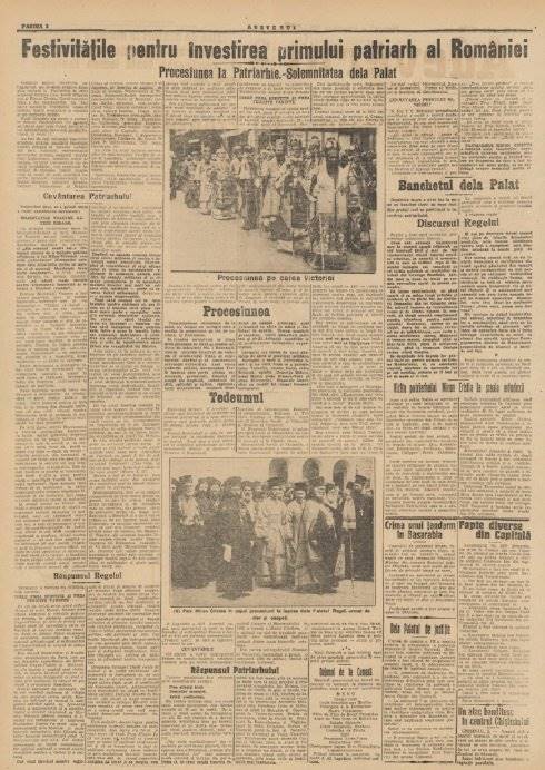 Ziua a început dimineața devreme cu Sfânta Liturghie oficiată în Catedrala Patriarhală, la care au participat clerul catedralei, mii de credincioși și înalți oaspeți străini, printre care mitropoliți din diverse Patriarhii ortodoxe. După liturghie, la Palatul Regal, Regele Ferdinand și Regina Maria au asistat la citirea decretului regal și la înmânarea cârjei patriarhale, consacrând oficial pe Miron Cristea în funcția de Patriarh.