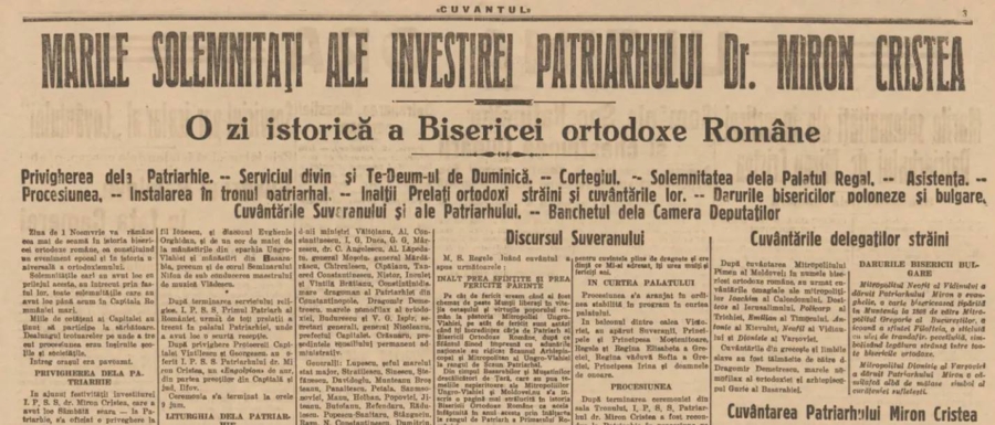 Acum 100 de ani, la 1 noiembrie 1925, Mitropolitul Miron Cristea, până atunci Mitropolit al Țării Românești, a fost întronizat ca primul Patriarh al României, într-o ceremonie de solemnitate fără precedent. Ridicarea Bisericii Ortodoxe Române la rang de Patriarhie fusese decisă anterior de Sfântul Sinod și consfințită prin lege promulgată de Regele Ferdinand I.