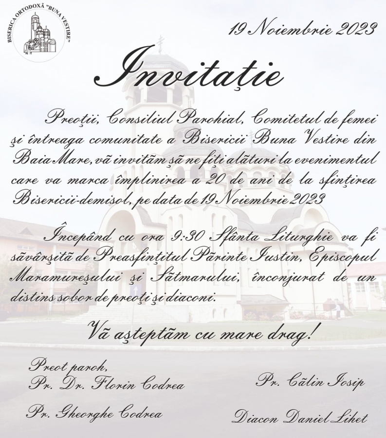 „Tuturor celor prezenți, cu bucuria slujirii Liturghiei și comuniunii de rugăciune, li se va pregăti un semn al mulțumirii și prețuirii noastre pentru mărturisirea și slujirea lui Hristos în Biserica Buna Vestire din Baia Mare de-a lungul anilor.