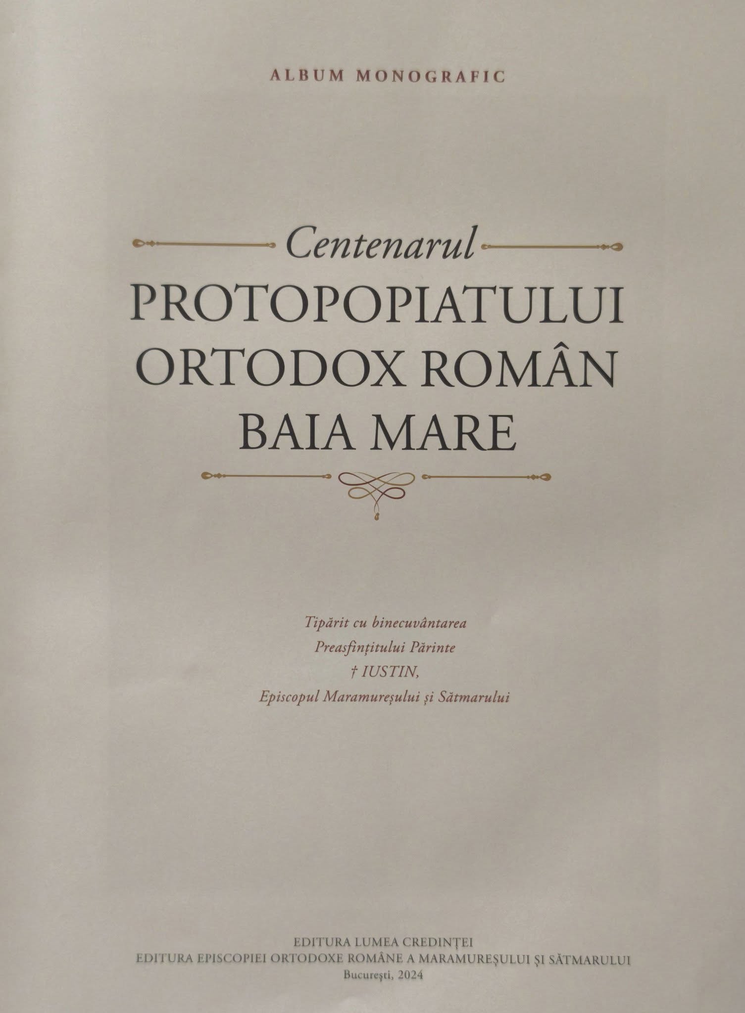 Cu binecuvântarea Preasfințitului Părinte Iustin, Episcopul Maramureșului și Sătmarului, la Editurile „Lumea Credinței” – București și cea a Episcopiei Ortodoxe Române a Maramureșului și Sătmarului – Baia Mare a apărut Albumul Monografic al Protopopiatului Ortodox Român Baia Mare, cu ocazia aniversării a 100 de ani de la înființare – Centenar (1924–2024).