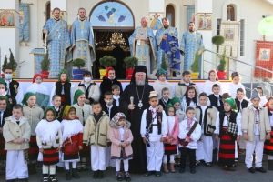 Preasfinţitul Iustin a fost primit cu multă bucurie de un grup de coconi şi cocoane de la clasa de balet a profesoarei Maria Seraz de la Palatul Copiilor din Baia Mare, îmbrăcaţi în frumoasele costume populare din zona Maramureşului Voievodal.