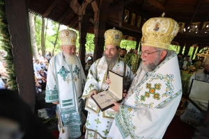Preasfinţitul Părinte Episcop Iustin a conferit Înaltpreasfinţitului Părinte Andrei şi Preasfinţitului Părinte Siluan al românilor din Ungaria cea mai prestigioasă distinţie „Crucea Voievodală Maramureşeană” şi engolpionul eparhial, cu motive din porţile maramureşene. Cele două distincţii au fost oferite şi Preasfinţitului Părinte Timotei Sătmăreanul.