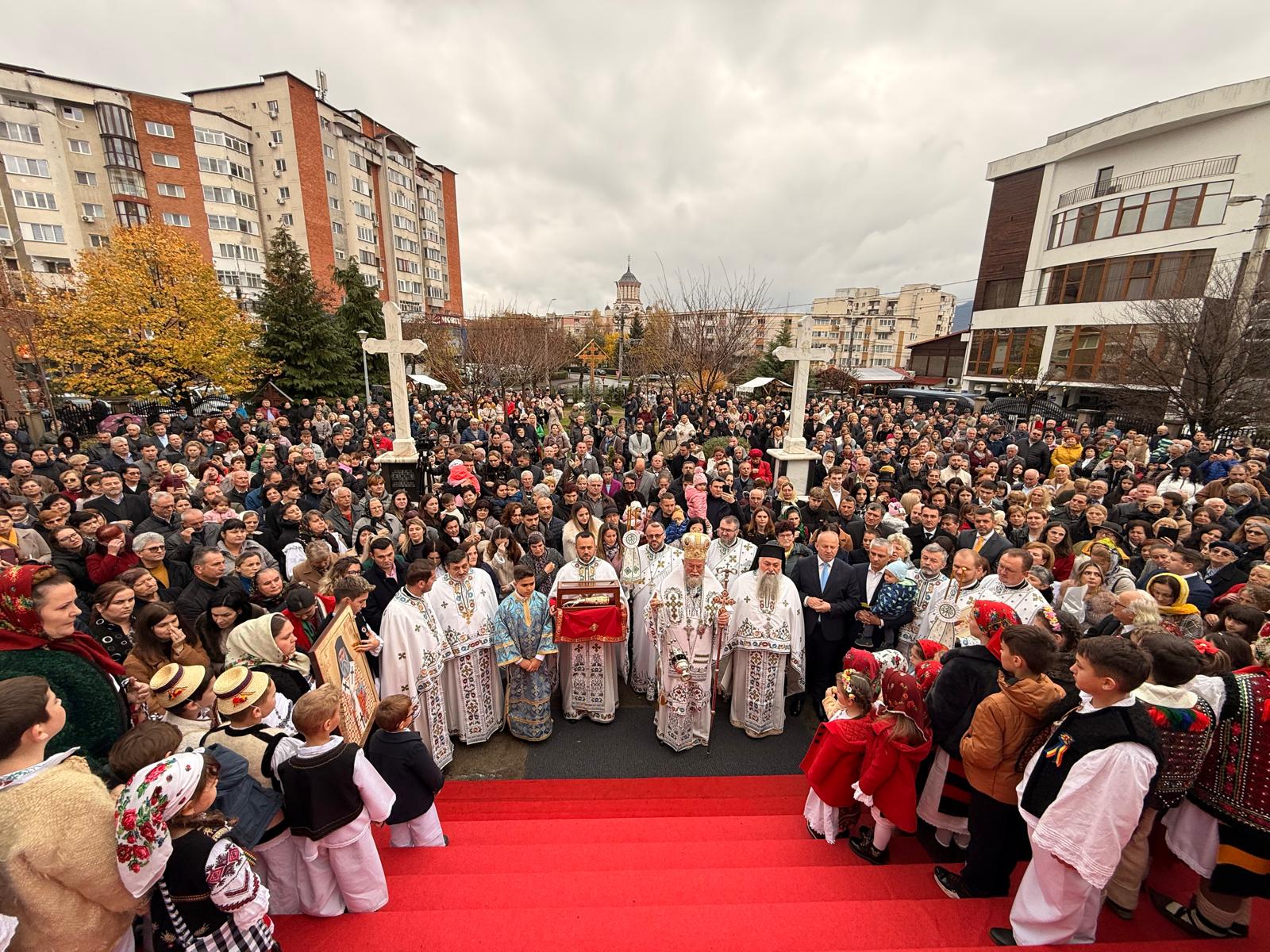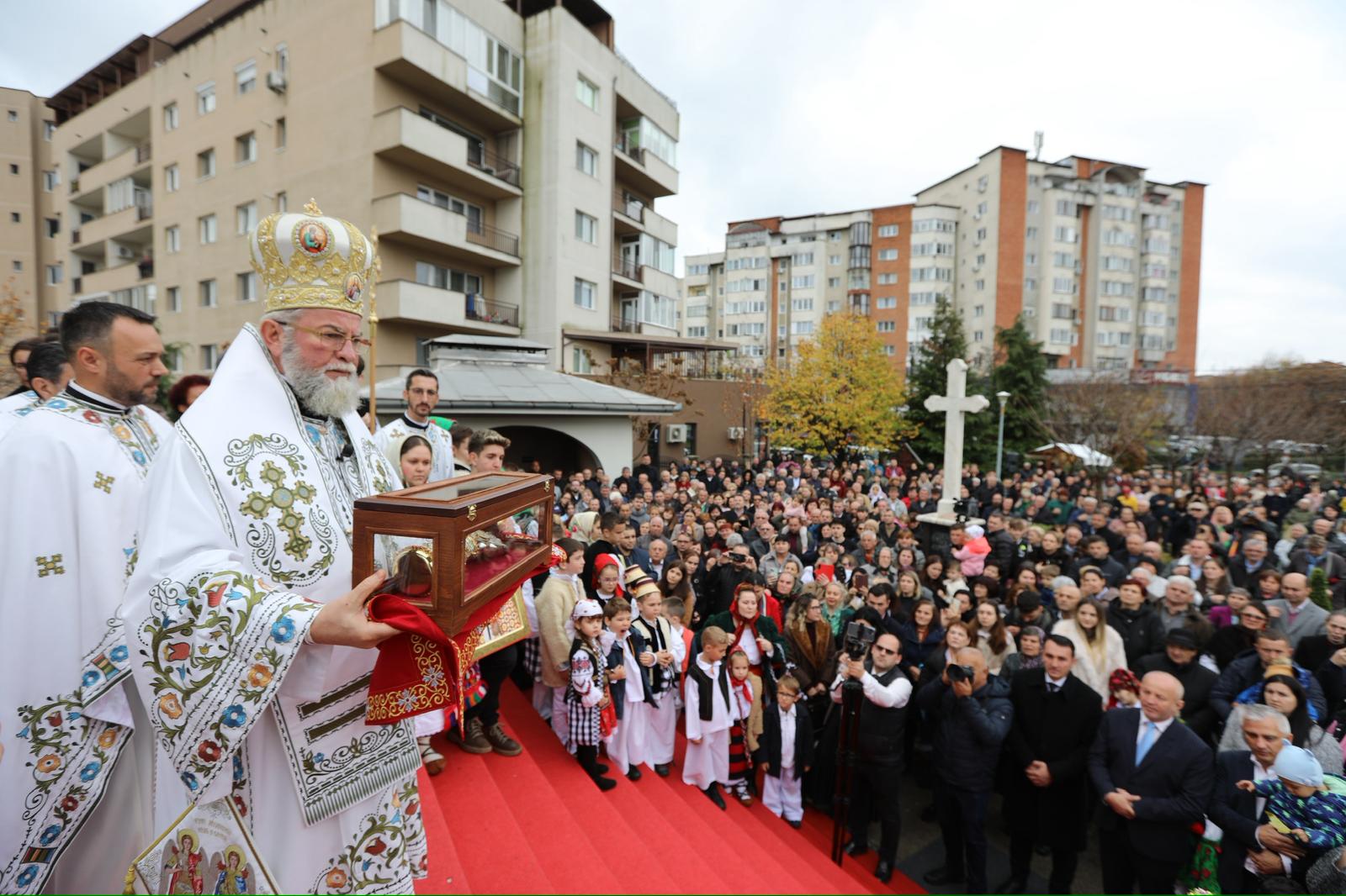 Anul acesta am revenit cu bucurie. S-a adus icoana Sfântului Ierarh Nectarie, Făcătorul de Minuni și Sfintele Moaște, de la schitul nostru pe dealul Viilor, din Baia Mare, și icoana Făcătoare de Minuni, de la Mănăstirea Bixad, cu Maica Domnului, spre bucuria credincioșilor. De trei zile s-au închinat credincioșii, atât la Sfintele Moaște, cât și la Sfintele Icoane, și este o mare bucurie și o mare binecuvântare să vezi evlavia credincioșilor și rânduiala sfântă care s-a așezat aici și care este bineplăcută lui Dumnezeu și oamenilor. Dăm slavă lui Dumnezeu pentru că, iată, săvârșim, sărbătorim hramul Bisericii o zi mai târziu. De Sfinții Arhangheli, de obicei suntem ocupați, suntem în Sighet și în municipiul Satu Mare și venim o duminică înainte, ori o duminică după, la această biserică, să săvârșim sărbătoarea hramului și să dăm cinstire Sfinților Arhangheli Mihai și Gavriil care sunt ocrotitorii acestei biserici. Slavă Lui Dumnezeu pentru toate!”, a spus PS Iustin.