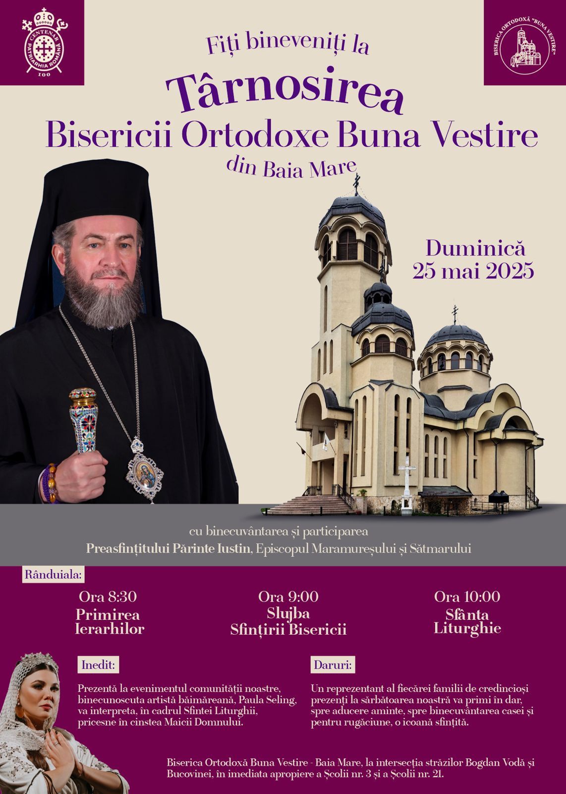 „Azi, 23 mai 2025, zi pregătitoare a Sfințirii Bisericii Buna Vestire din Baia Mare, vom săvârși Taina Sfântului Maslu în sobor de preoți, cu stăruitoare rugăciuni de har și binecuvântare pentru toți și toate”, transmite pr. dr. Florin Codrea.