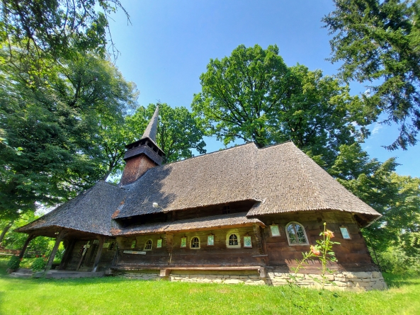 Biserica este făcută din bârne mari suprapuse, fiecare având lăţimea de 50-60cm. Absida altarului este poligonală decroşată, naosul supraînălţat este acoperit cu o boltă semicirculară şi împreună cu pronaosul au formă dreptunghiulară cu streaşină dublă. Pe latura vestică a edificiului este situat turnul – clopotniţă, a cărui şarpantă este în formă de coif.