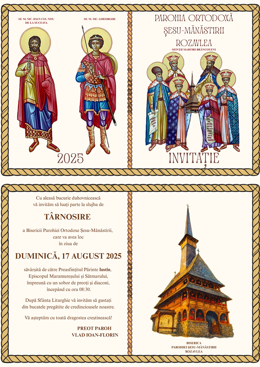 „Iubiți credincioși, cu nespusă bucurie și recunoștință adusă lui Dumnezeu, vă anunțăm că, după multe încercări, osteneală și rugăciune, a venit vremea harului și a binecuvântării: DUMINICĂ, 17 AUGUST 2025, Biserica Ortodoxă „Șesu-Mănăstirii” din Rozavlea va fi târnosită (sfințită), spre slava lui Dumnezeu și întărirea sufletelor noastre.