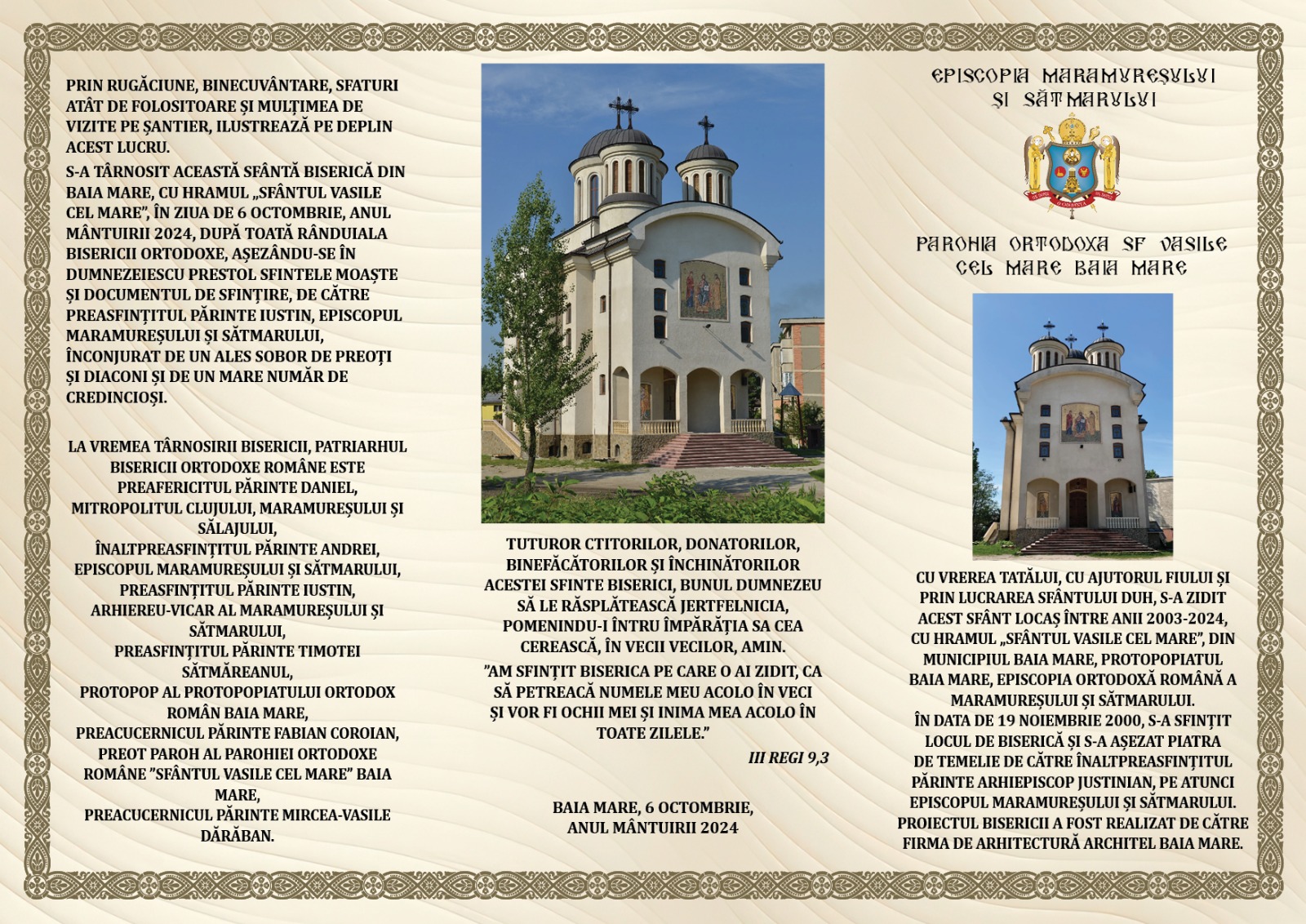 Duminică, 6 octombrie, a 20-a după Rusalii, Preasfințitul Părinte Iustin, Episcopul Maramureșului și Sătmarului, a târnosit biserica parohiei cu hramul „Sfântul Ierarh Vasile cel Mare” din Baia Mare, după care a săvârșit Sfânta Liturghie în fruntea unui sobor de preoți și diaconi, în prezența credincioșilor și a autorităților locale.