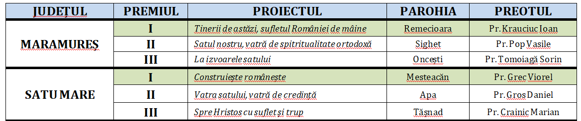 În județul Maramureș, premiul I a fost câștigat de echipa de cateheză a Parohiei Remecioara (pr. Ioan Krauciuc) – protopopiatul Chioar, cu proiectul ”Tinerii de astăzi, sufletul României de mâine, iar în județul Satu Mare, echipa de cateheză a Parohiei Mesteacăn (pr. Viorel Grec), cu proiectul ”Construiește românește”.