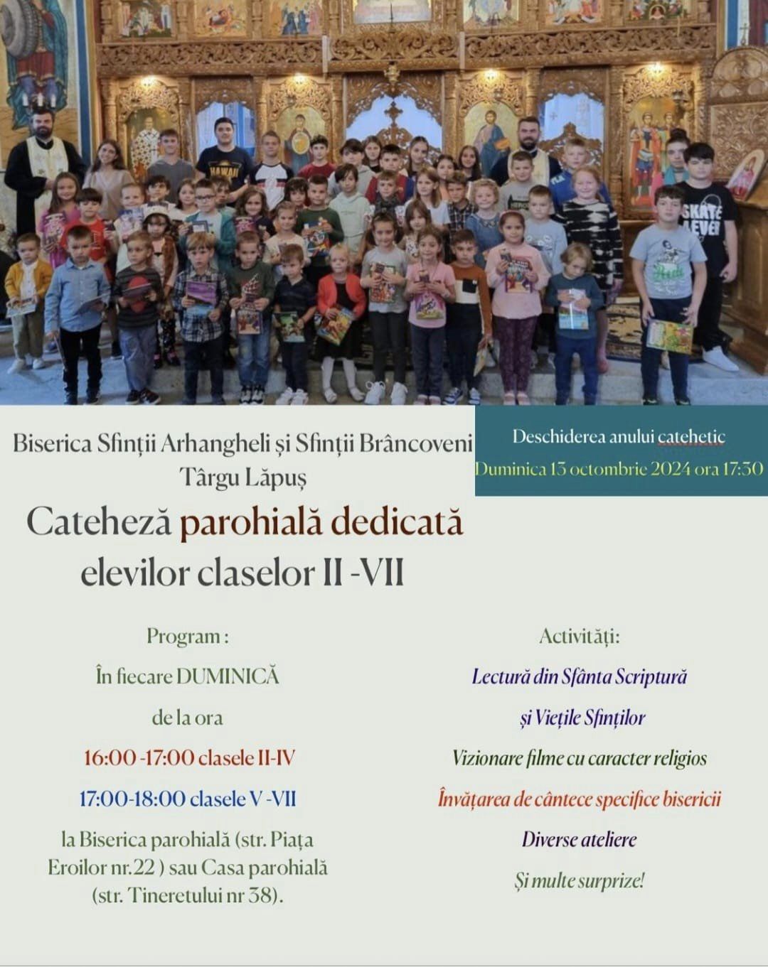 Începând de azi, 13 octombrie, la Biserica Sfinții Arhangheli și Sfinții Brâncoveni Târgu Lăpuș se va desfășura Cateheză parohială dedicată elevilor din clasele II-VII.