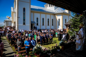 Sfânta Liturghie a fost săvârșită pe o scenă special amenajată în curtea bisericii, pentru a permite mulțimii credincioșilor să participe la acest eveniment din viața parohiei.