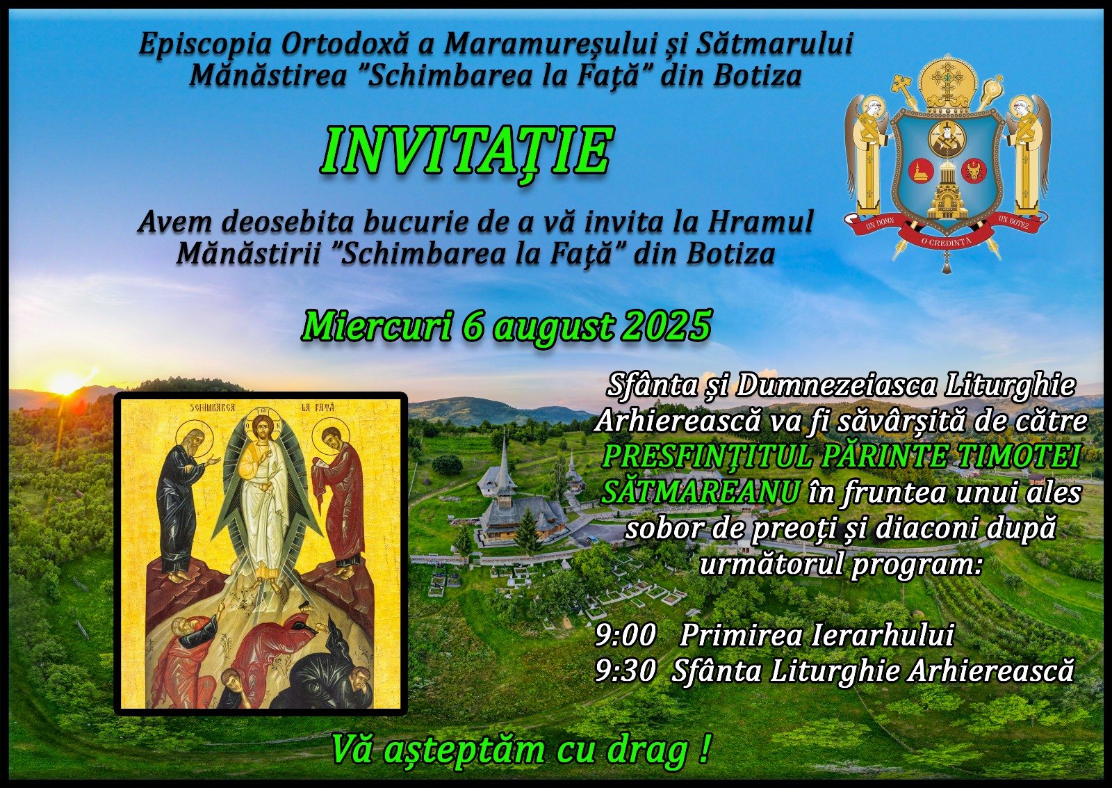 Miercuri, 6 august, de Praznicul Schimbării la Față a Domnului, Preasfințitul Părinte Timotei Sătmăreanul, Arhiereu-vicar al Episcopiei Maramureșului și Sătmarului, va sluji la Mănăstirea Botiza, Protopopiatul Vișeu, cu ocazia hramului așezământului monahal.