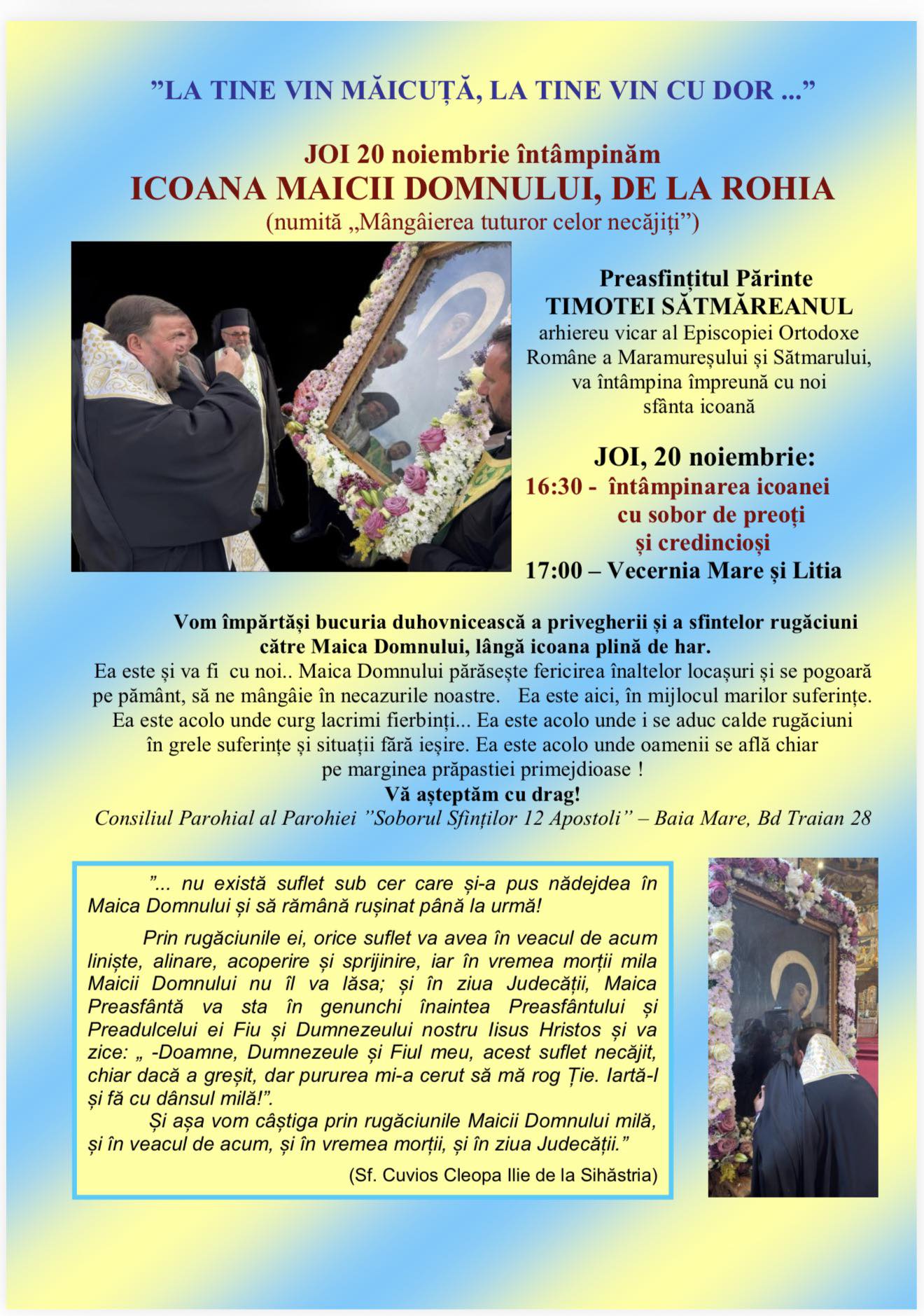 Azi, 20 noiembrie, Icoana Maicii Domnului de la Mănăstirea Rohia (numită „Mângâierea tuturor celor necăjiți”) ajunge în Parohia „Soborul Sfinților 12 Apostoli” din Baia Mare (bd. Traian).