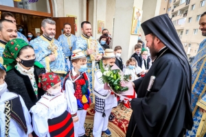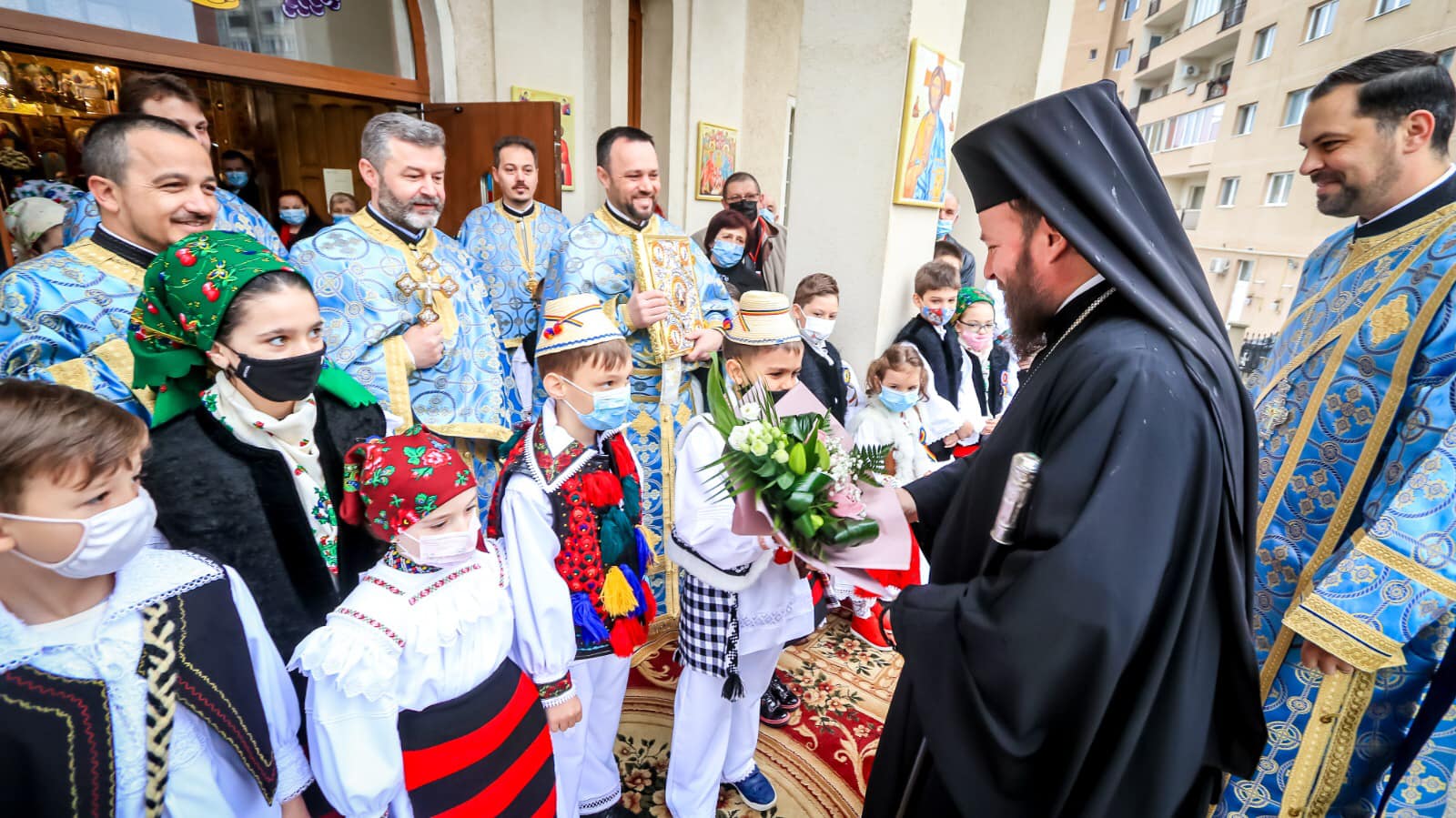 După slujba Sfintei Liturghii, Preasfințitul Părinte Timotei Sătmăreanul a conferit Diploma de vrednicie pentru Ansamblul Folcloric „Hori și Joc” Palatul Copiilor, coordonat de prof. coregraf Maria Seraz, instituție condusă de prof. dr. Ion Iuga, în semn de înaltă apreciere și prețuire pentru întreaga activitate didactică, culturală și pentru promovarea portului și a tradițiilor populare.