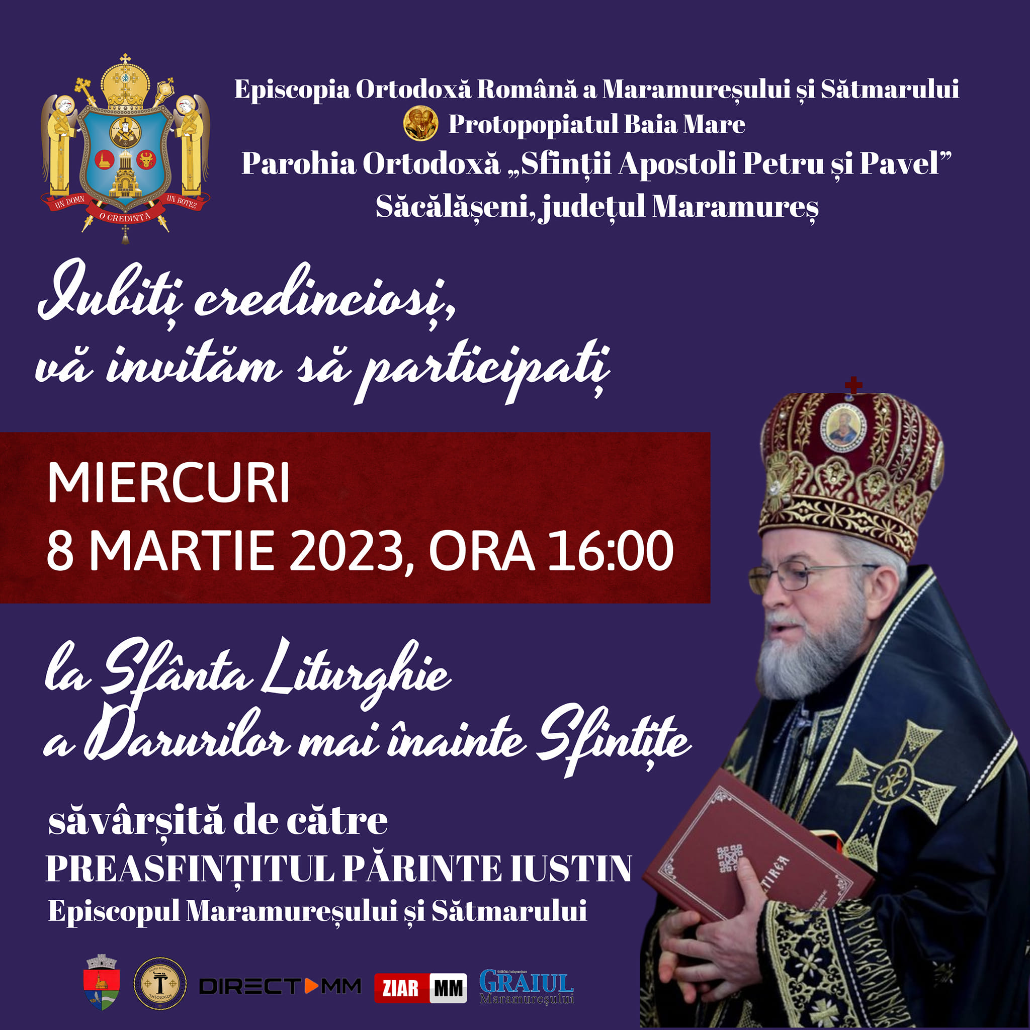 Miercuri, 8 martie, de la ora 15.30, PS Părinte Iustin, Episcopul Maramureșului și Sătmarului, va săvârși Sfânta Liturghie a Darurilor înainte sfințite în Parohia Ortodoxă „Sfinții Apostoli Petru și Pavel” Săcălășeni.