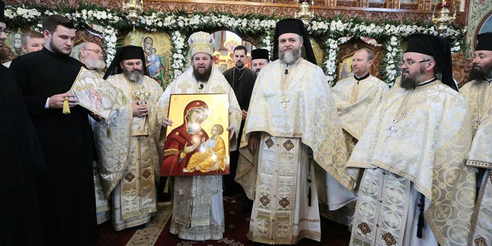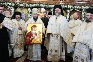 La finalul Liturghiei, arhim. Teofil Pop, starețul Mănăstirii, i-a dăruit Arhiereului, din partea obștii monahale, o icoană pictată cu chipul Maicii Domnului și o bederniță brodată reprezentând Praznicului Întâmpinării Domnului nostru Iisus Hristos.