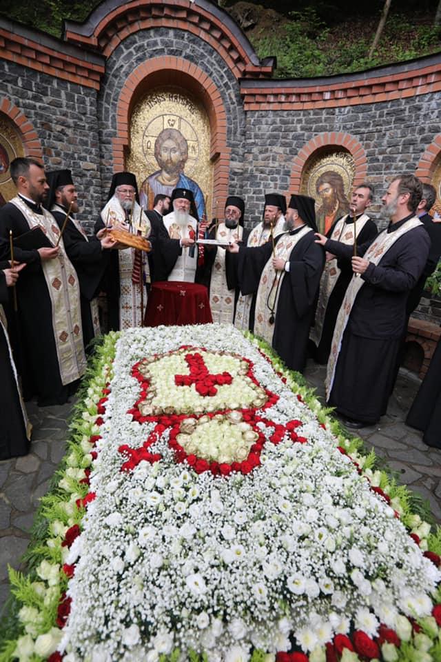 După Sfânta Liturghie Arhierească, Înaltpreasfinţitul Părinte Mitropolit Andrei, Preasfinţitul Părinte Episcop Iustin şi Preasfinţitul Părinte Timotei Sătmăreanul, Arhiereu-Vicar, au fost urmaţi, cu lumânări aprinse în mâini, de întreg soborul de preoţi, monahi şi monahii şi poporul drept credincios la mormântul Înaltpreasfinţitului Părinte Arhiepiscop Justinian, unde a fost oficiată slujba Parastasului. A fost un moment înălţător, de sinceră cinstire, când din sufletele tuturor s-au înălţat către cer, într-un cor, parcă îngeresc, rugăciunile pentru cel care a fost ctitorul duhovnicesc şi material al Rohiei, de la amvonul căreia a zidit suflete al căror glas să se înalţe către Dumnezeu, către Maica Domnului. Glasul său inconfundabil de predicator cu mare forţă a cuvântului parcă răsună şi azi peste codrii din jur a rugă şi dojană, a îndreptare şi căinţă pentru păcatele săvârşite. Pentru toate, cei prezenţi i-au mulţumit în gând marelui Ierarh Justinian.