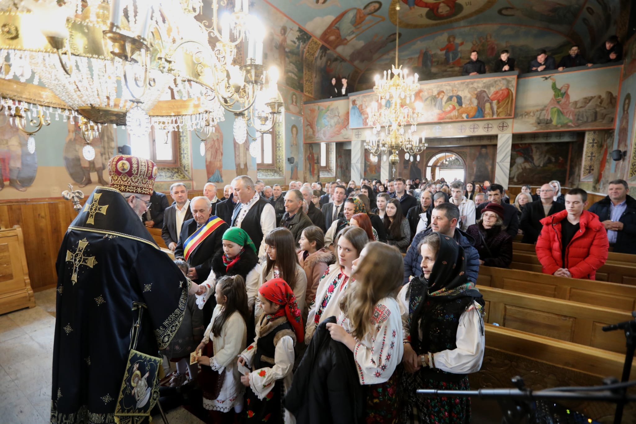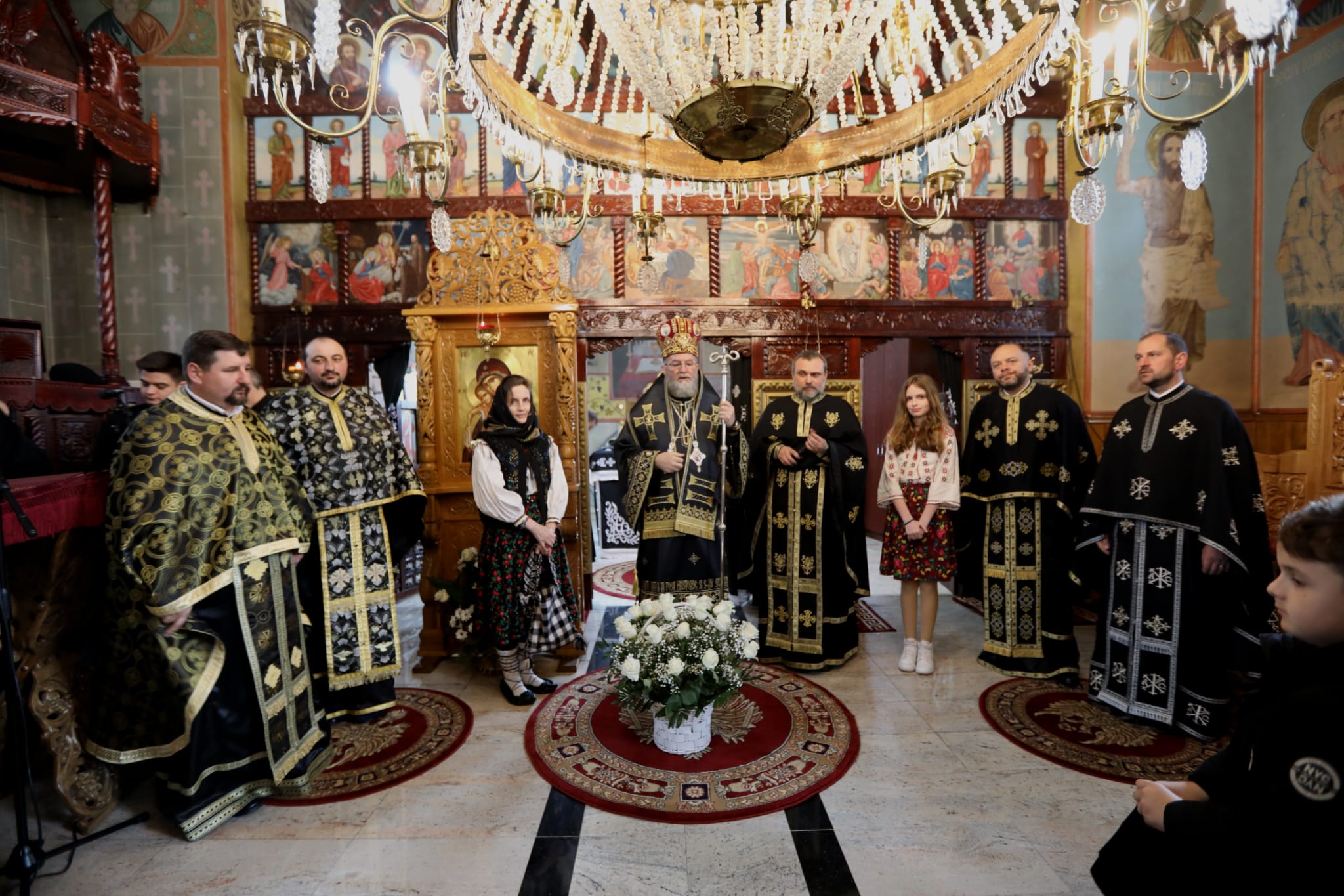 La final, părintele paroh a mulțumit Preasfințitului Părinte Episcop Iustin pentru prezența în mijlocul credincioșilor și pentru slujire, și, în semn de recunoștință și prețuire, a oferit Preasfinției Sale o icoană cu Sfinții Arhangheli Mihail și Gavriil, ocrotitorii bisericii, și un coș cu flori.