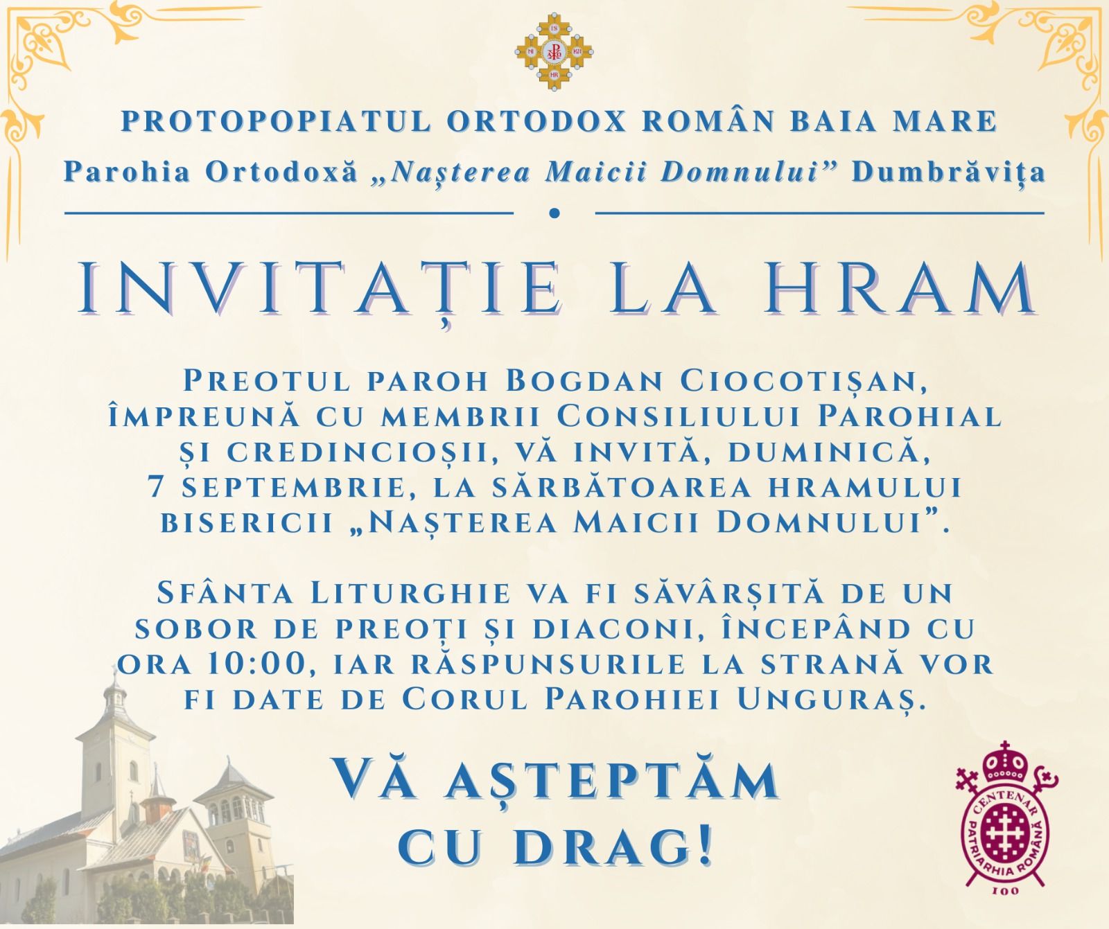 Cu aleasă bucurie duhovnicească, preotul paroh Bogdan Ciocotișan, împreună cu membrii Consiliului Parohial și întreaga comunitate de credincioși, vă invită să luați parte duminică, 7 septembrie, la prăznuirea hramului bisericii închinate „Nașterii Maicii Domnului”.