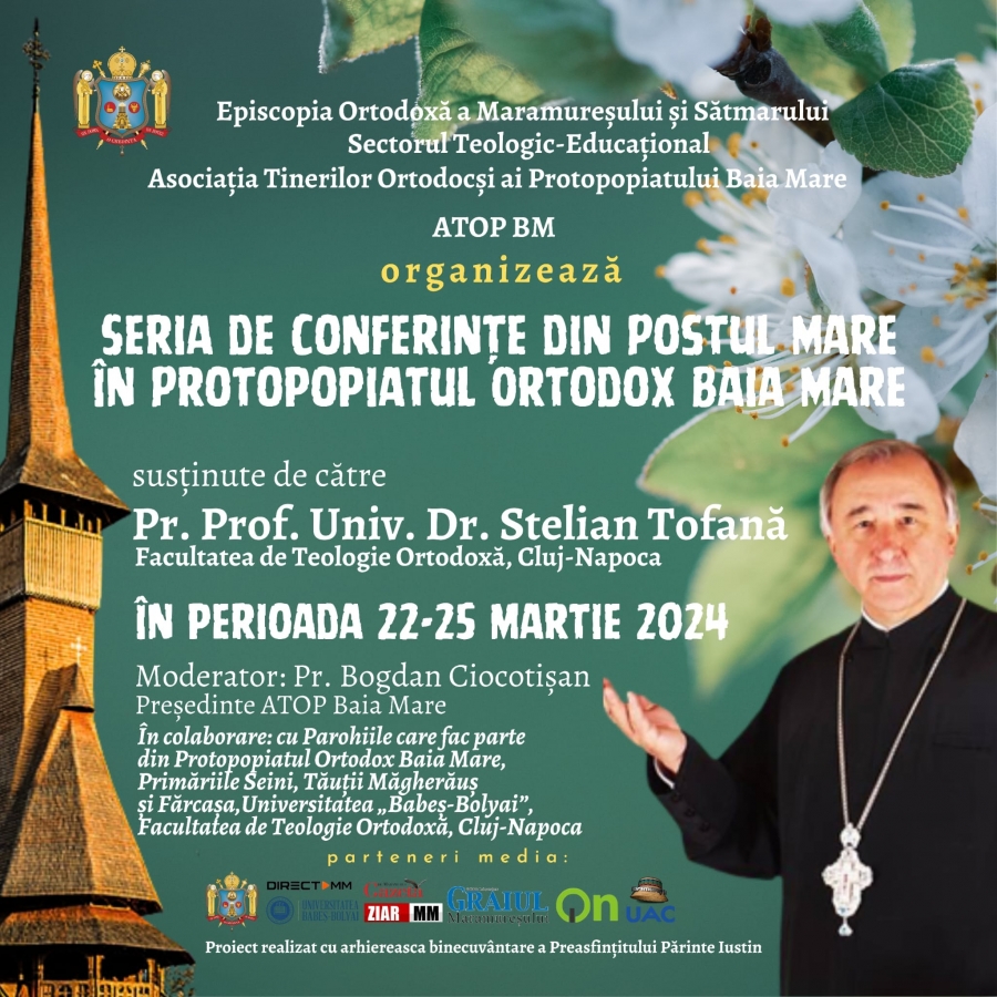 Zilele viitoare, pr. prof. univ. dr. Stelian Tofană de la Facultatea de Teologie Ortodoxă din Cluj-Napoca va susține conferințe în mai multe localități din Maramureș. Evenimentele se desfășoară cu binecuvântarea Preasfințitului Părinte Iustin.
