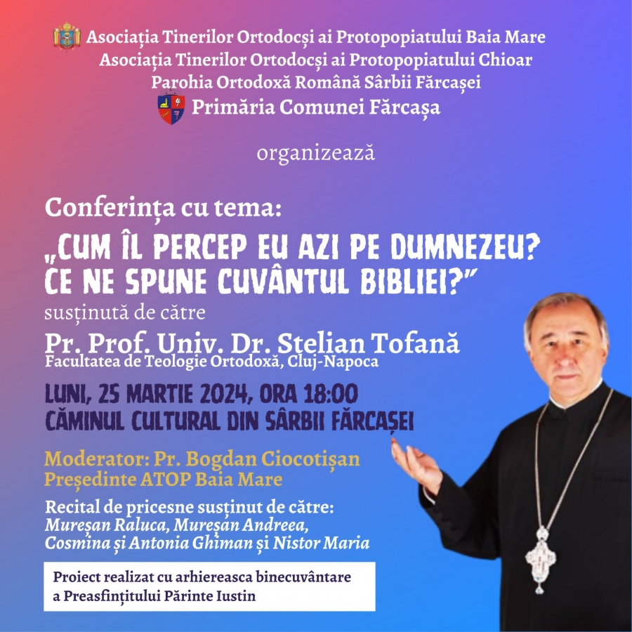 Astfel, luni, 25 martie, de la ora 18.00, la Căminul Cultural din Sârbi (comuna Fărcașa) va avea loc conferința intitulată „Cum îl percep eu azi pe Dumnezeu și ce ne spune cuvântul Bibliei?”. Moderator va fi pr. Bogdan Ciocotișan, președinte ATOP Baia Mare.