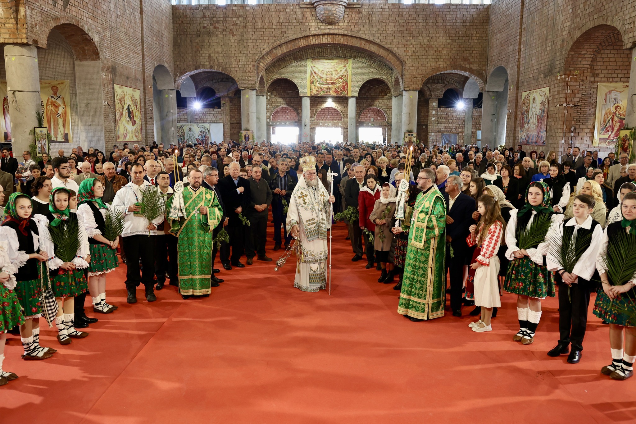 Ne bucurăm că, după mai multe evenimente care au avut loc la Catedrala Episcopală „Sfânta Treime”, inclusiv cel de aseară, măreţul concert al Corului de Cameră Naţional „Madrigal” şi care a concertat în faţa a peste o mie de maramureşeni, de băimăreni, a susţinut, de fapt, un concert ce se numeşte „Săptămâna Patimilor”, iată-ne în Catedrala noastră Episcopală „Sfânta Treime”, tot în spaţiul de sus, cu sărbătoarea praznicului împărătesc, aducând slavă lui Dumnezeu şi făgăduind Mântuitorului că, intrând în Săptămâna Sfintelor Pătimiri şi ajungând în Joia procesului şi în Vinerea Răstignirii, nici nu vom striga ‹‹Răstigneşte-L, Răstigneşte-L››, nici nu vom huli când va fi pe Cruce, precum au făcut cărturarii şi fariseii, ci Îl vom însoţi ca şi Femeile Mironosiţe, aşteptând cu evlavie şi cu credinţă, să se împlinească făgăduinţa Mântuitorului, Care a zis că a treia zi va Învia, ca să putem şi trăi bucuria pe care au avut-o Apostolii şi Mironosiţele Femei când L-au văzut pe Hristos Înviat. Astăzi poartă credincioşii ramuri de salcie, ramuri de finic în Orient, ramuri verzi, pentru a fi purtate în procesiune şi a fi sfinţite apoi de slujitorii lui Dumnezeu, să fie duse la casele lor ca un semn al binecuvântării.