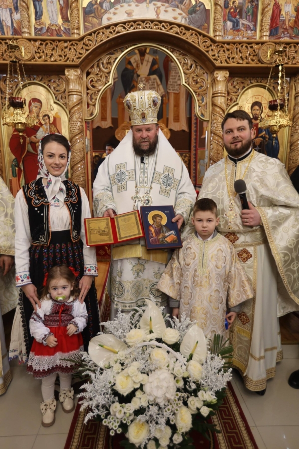 În încheiere, Pr. Mădălin Tăut a mulțumit PS Timotei Sătmăreanul pentru prezența în mijlocul credincioșilor și pentru slujire și, în semn de recunoștință și prețuire, a oferit ierarhului o icoană cu chipul Sfântului Apostol și Evanghelist Matei, Placheta Aniversară și un aranjament floral.